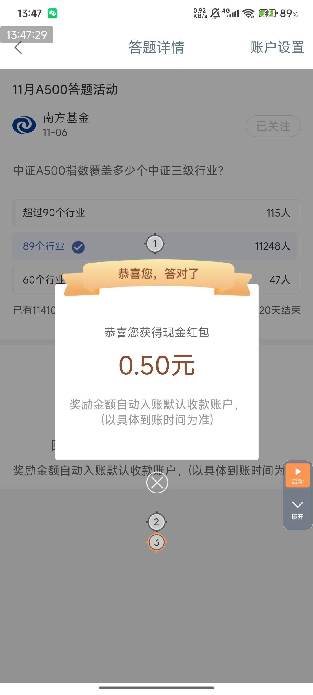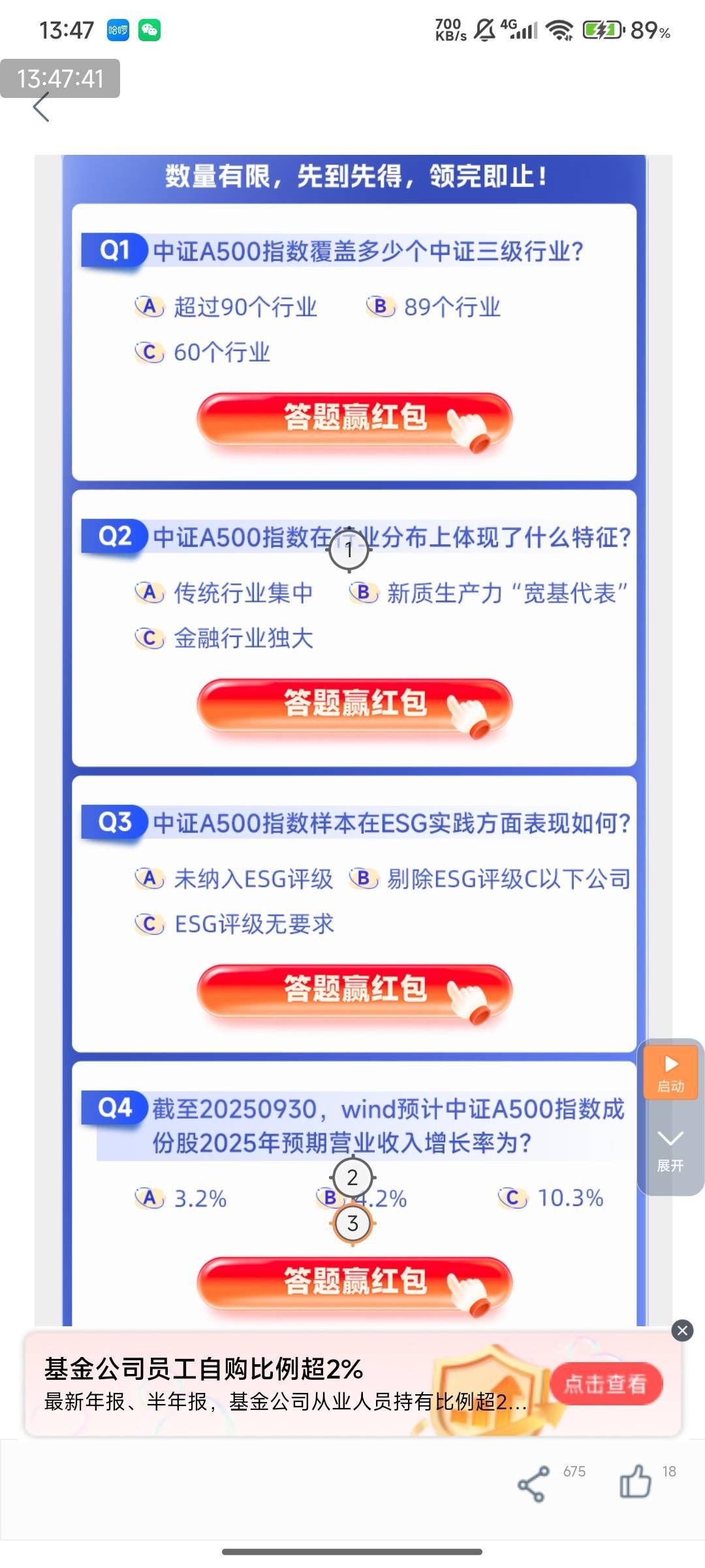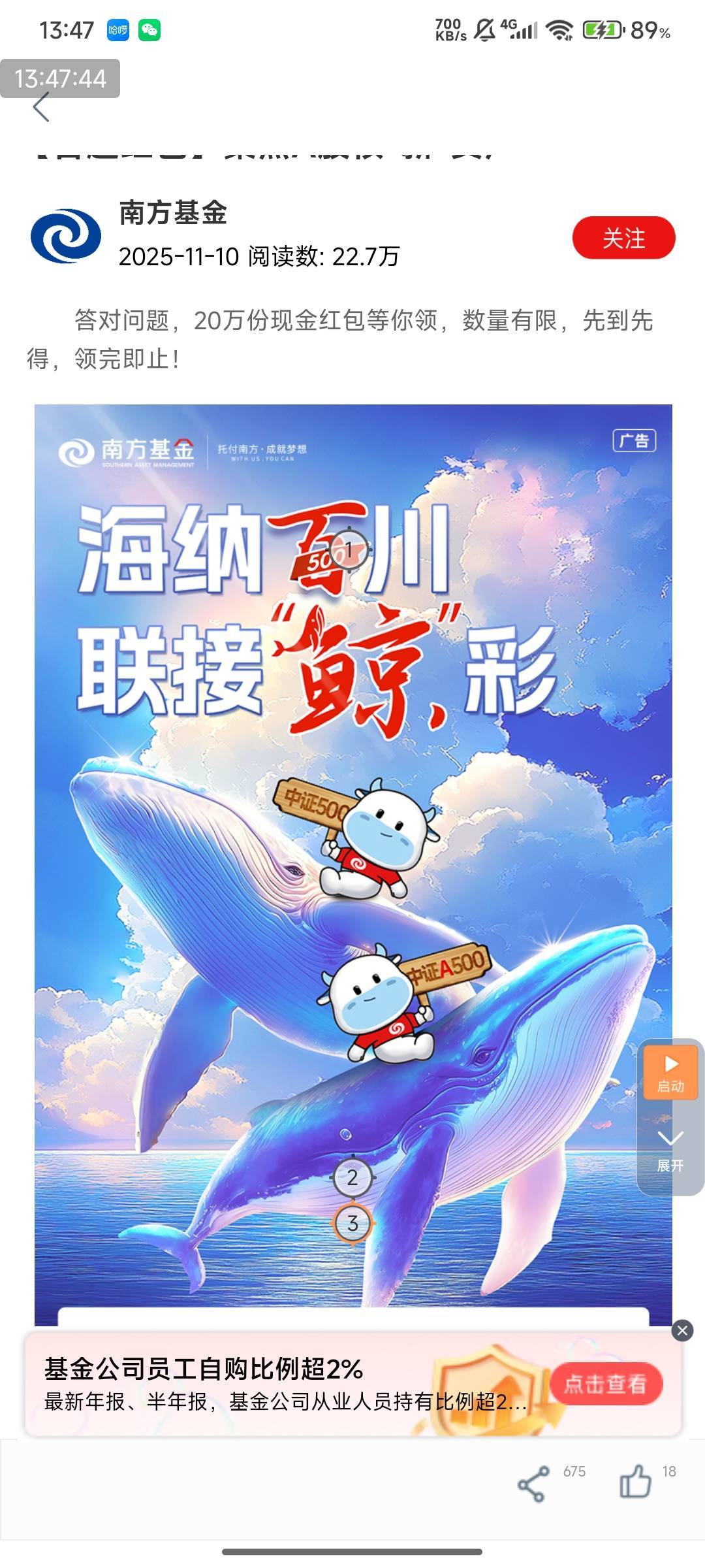 2.5现金,工行App搜索.南方基金.,下拉找到场景号进入南方基金场景号,再下拉找到.海纳百川 联接鲸彩.进入答题(不是横幅那个一直下拉如图),总共5题,每个0.5,每道题都选b,提示火爆一直点