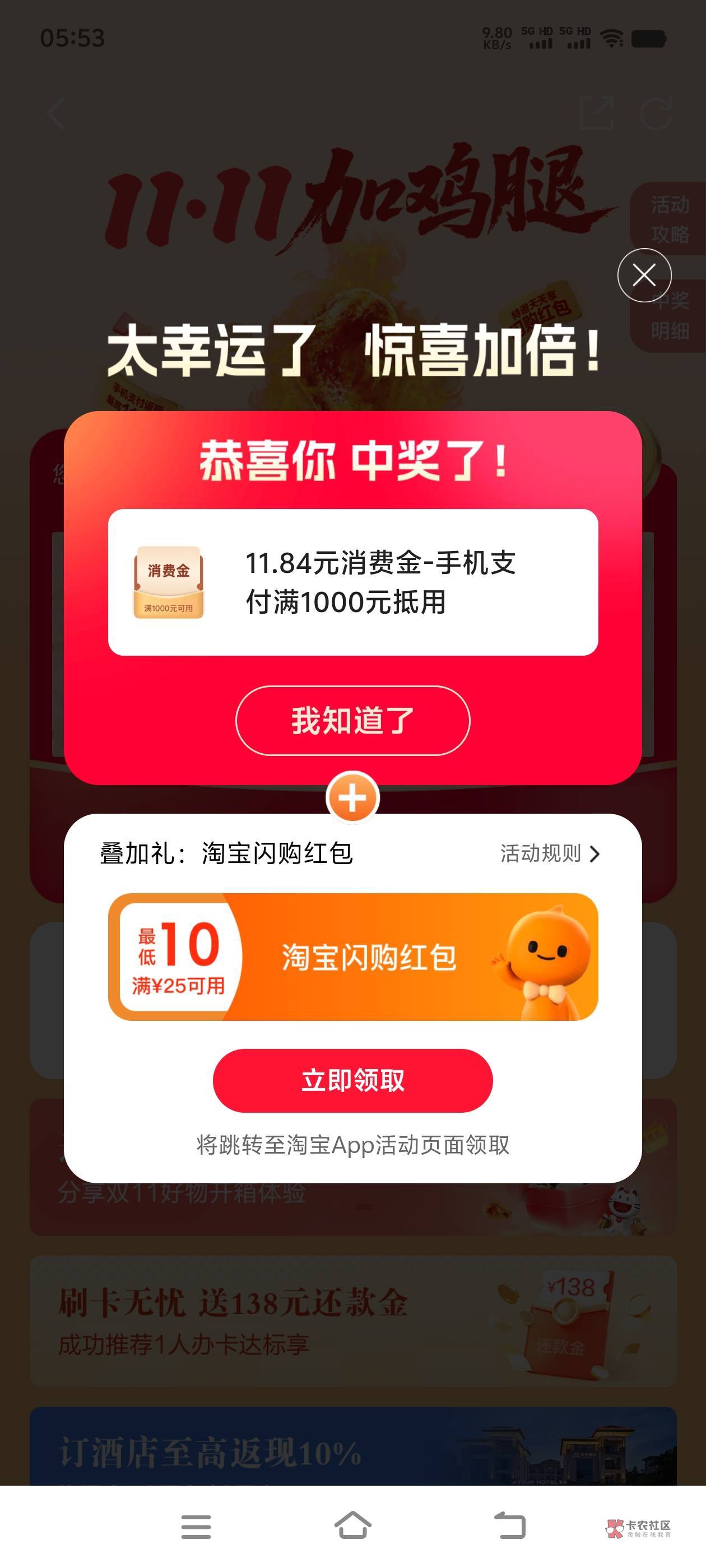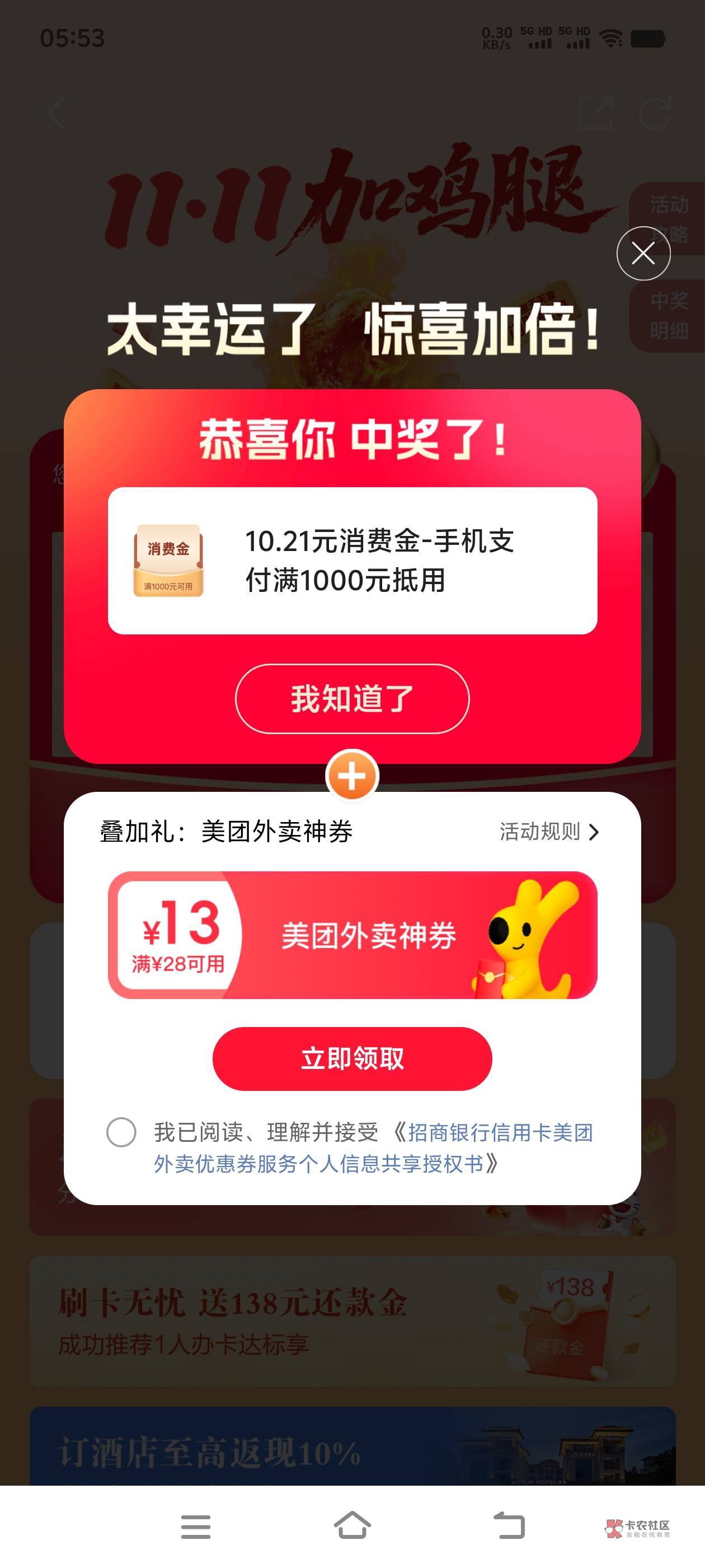 招行信用卡消费满18抽一次!双11加鸡腿!