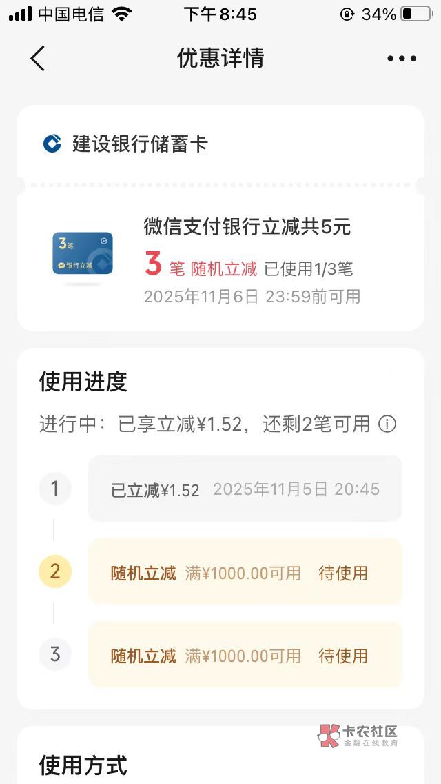 建行储蓄卡微信支付三笔5毛