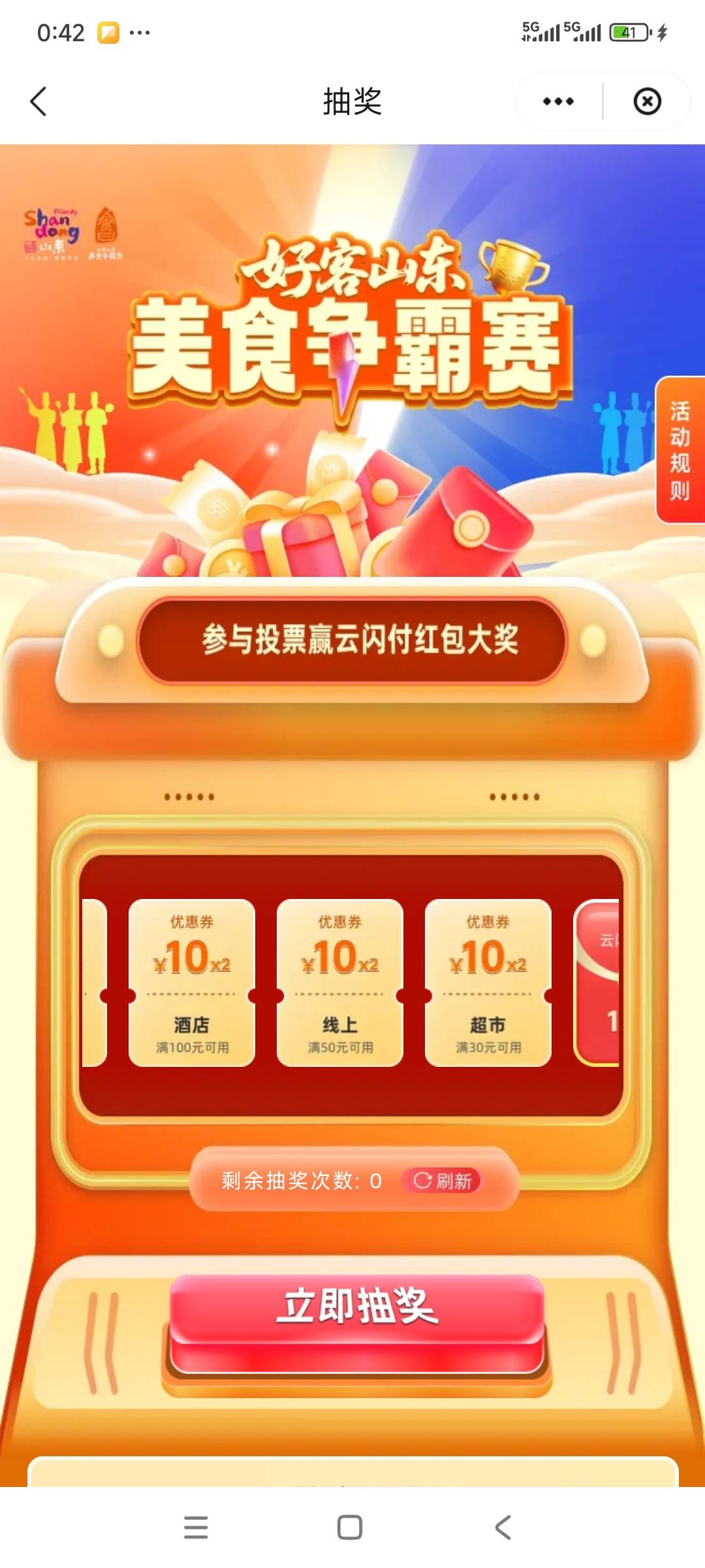 云闪付山东全境,本地横幅,微家长美食投票,得1~100红包