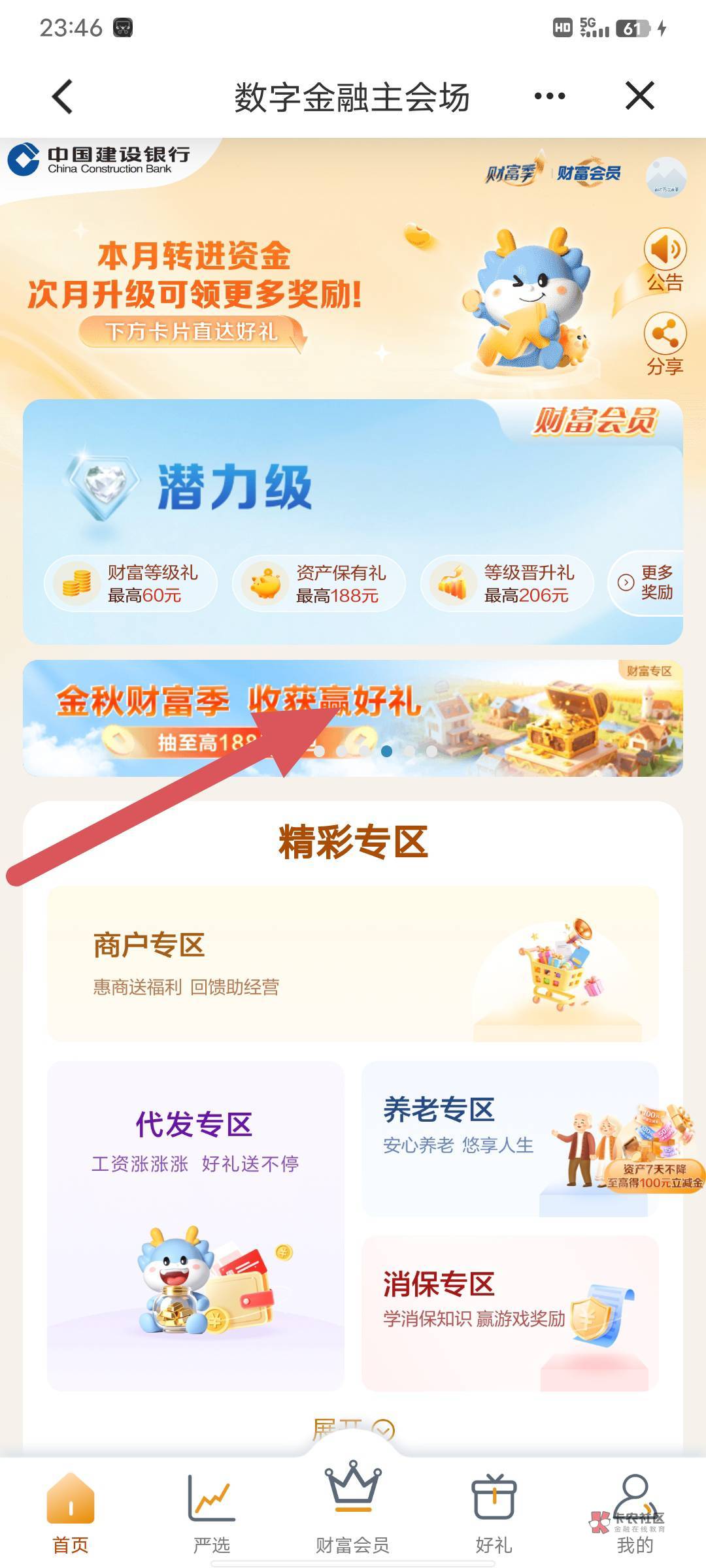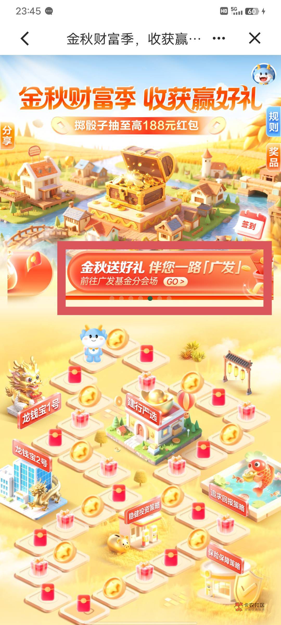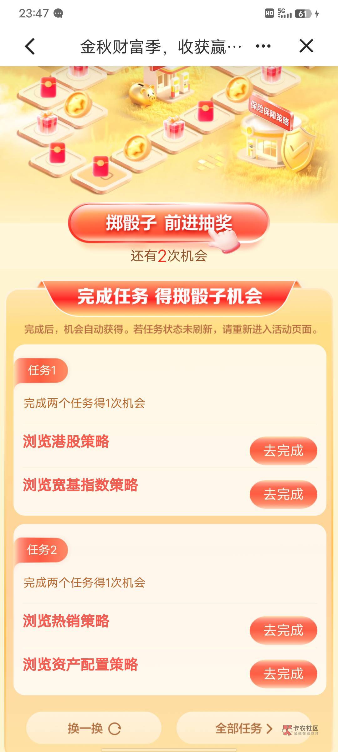 建行搜财富季,图中横幅下方做任务领取抽奖次数每天抽5次,中间任务早.0开启
