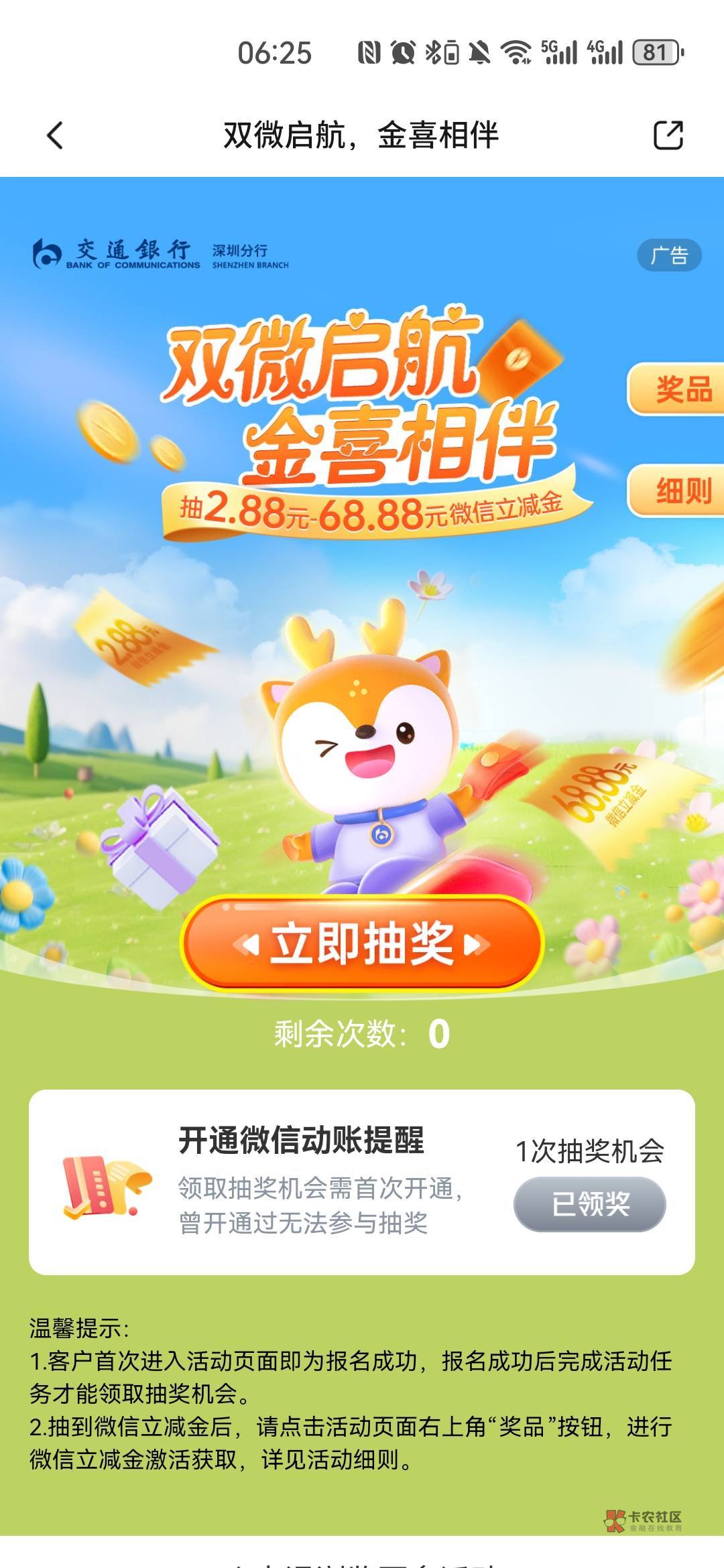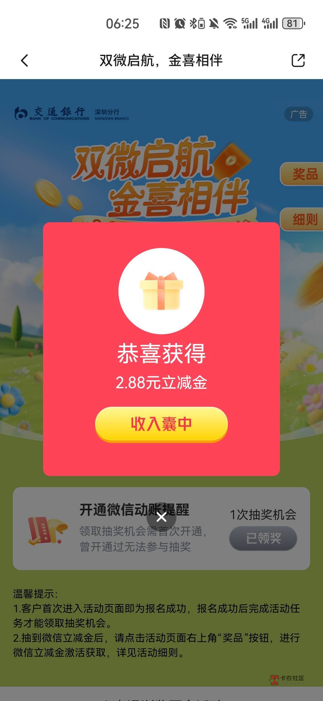 交通银行,深圳,保底2.88,好运老哥去拿68.88 以前绑过微信,换新号微信绑也可以完成