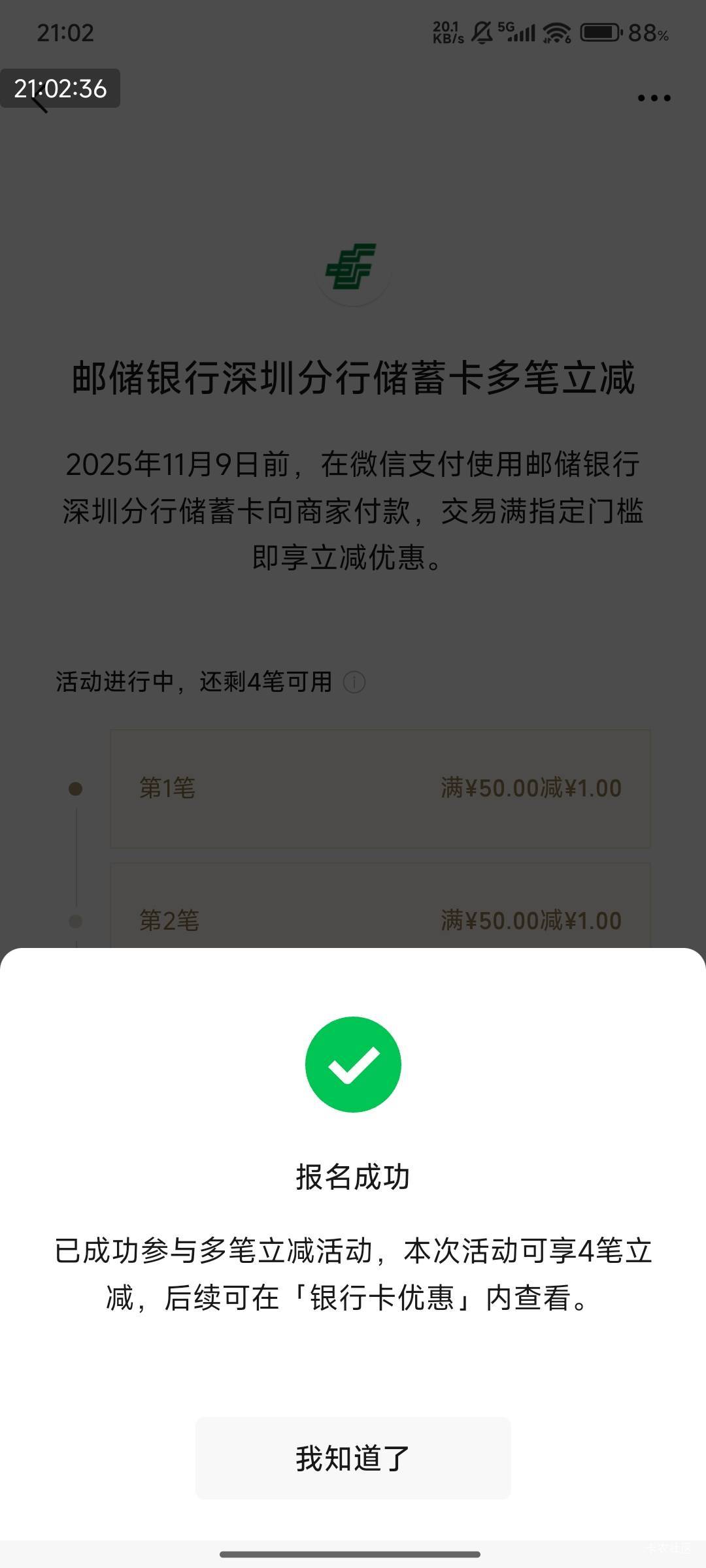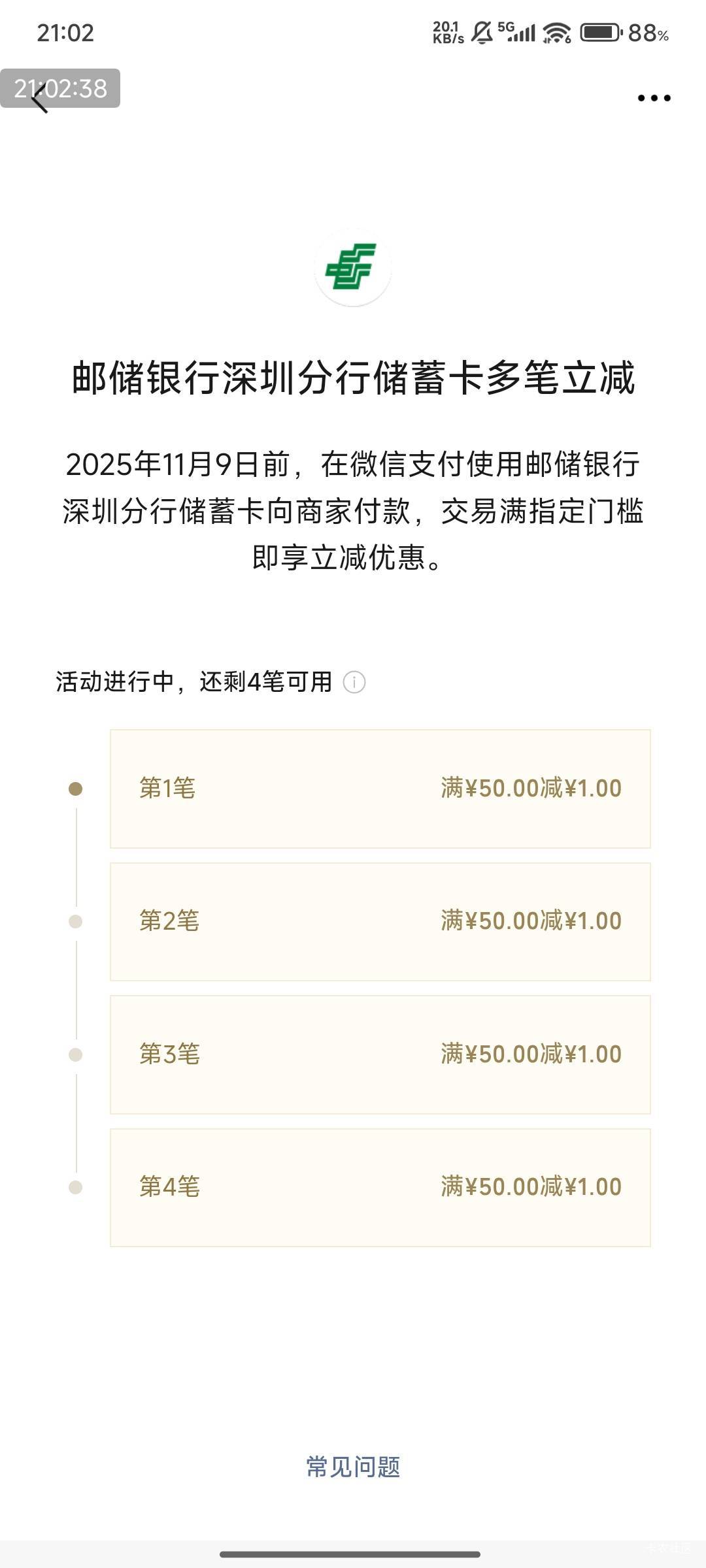 邮储银行深圳分行储蓄卡多笔立减