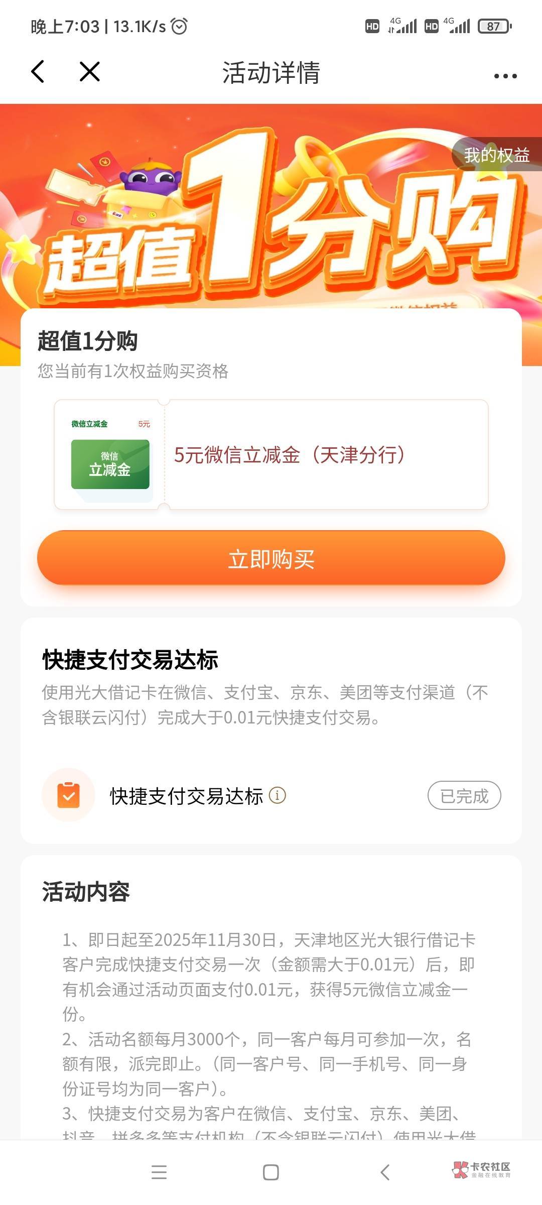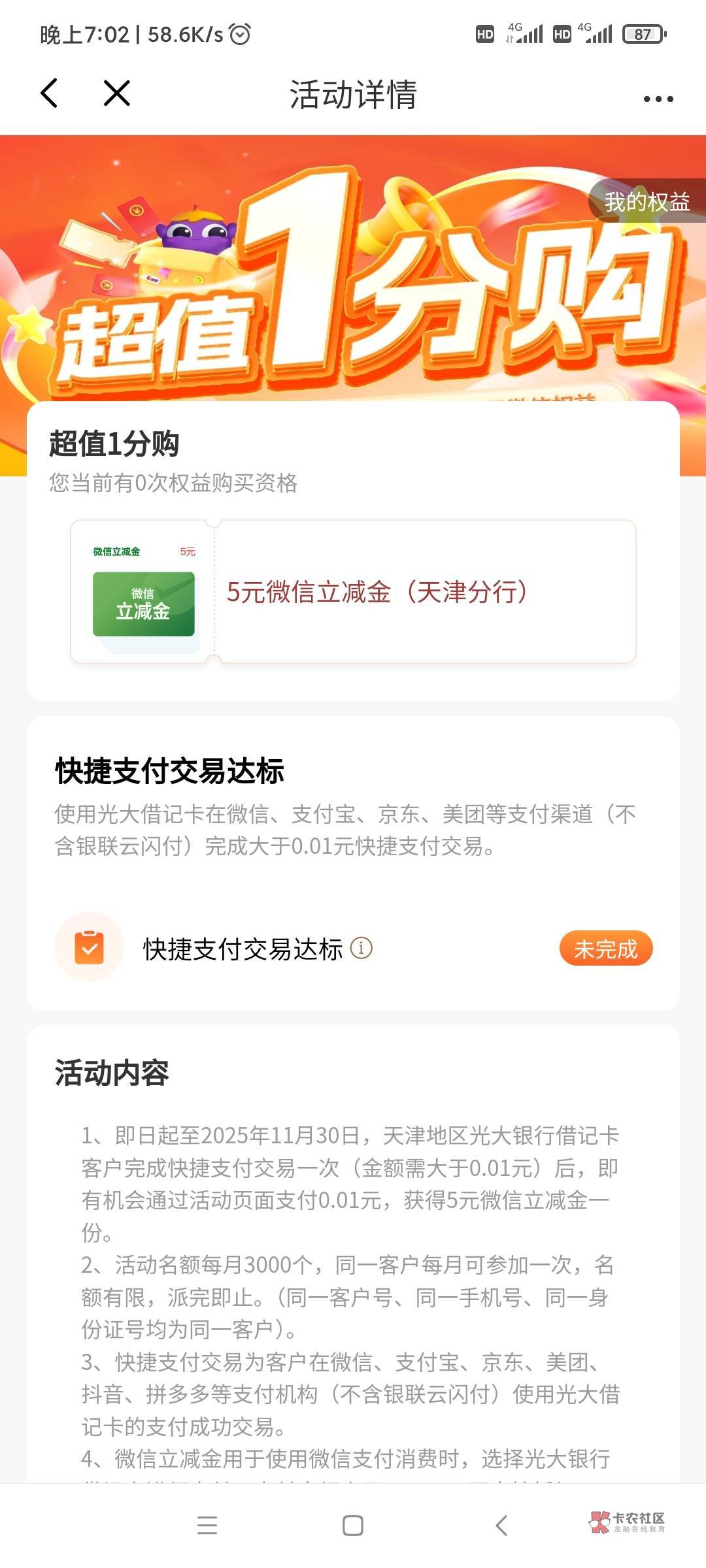 首发!光大银行天津分行超值一分购,快捷支付大于0.01达标付0.01买5立减!