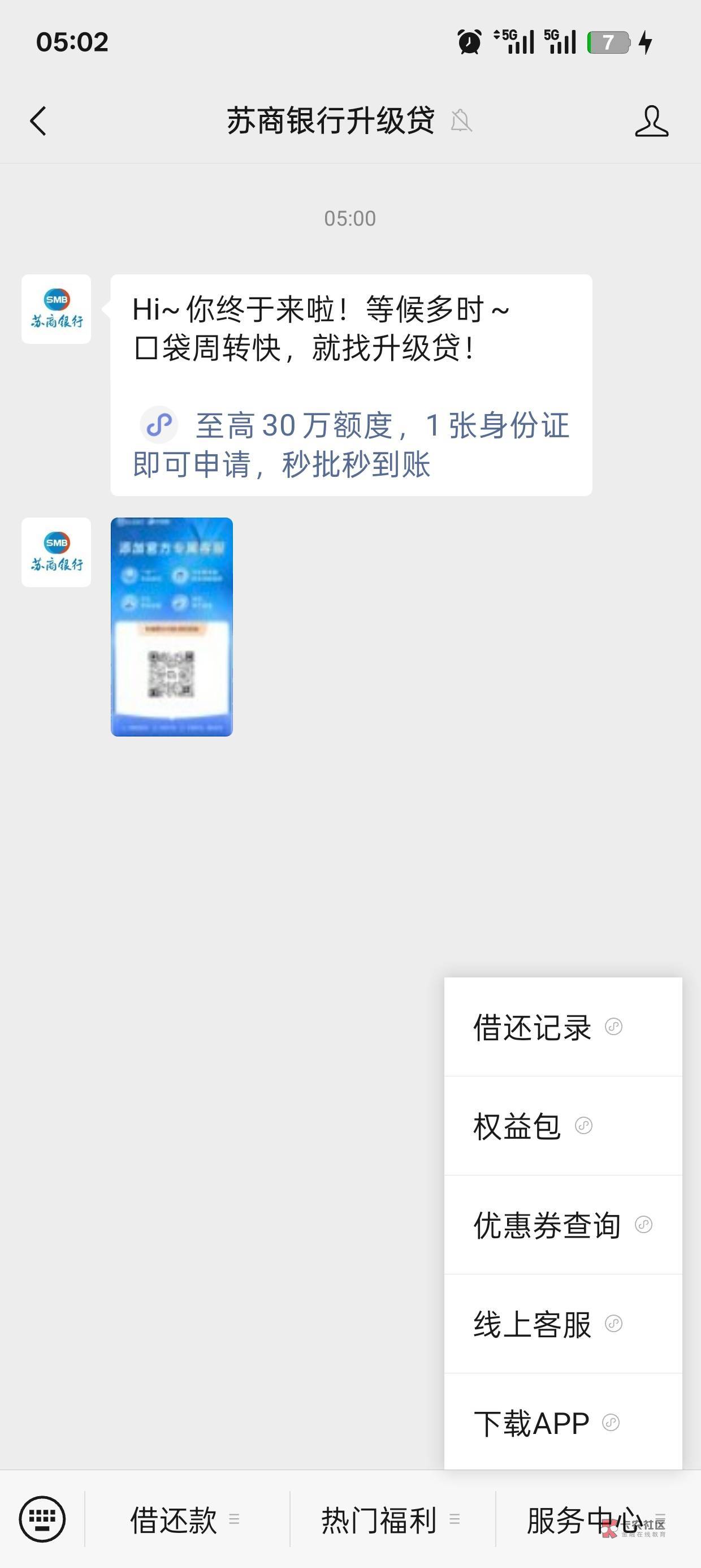 关注苏商银行升级贷公众号,服务中心权益包领2毛,不用谢
