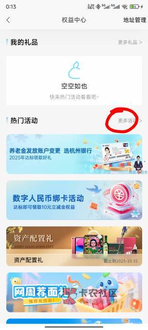首发? ? 杭州银行,我的权益,更多活动。神秘社友征集活动,点进去完成任务抽1.88到18.8立减,刚中