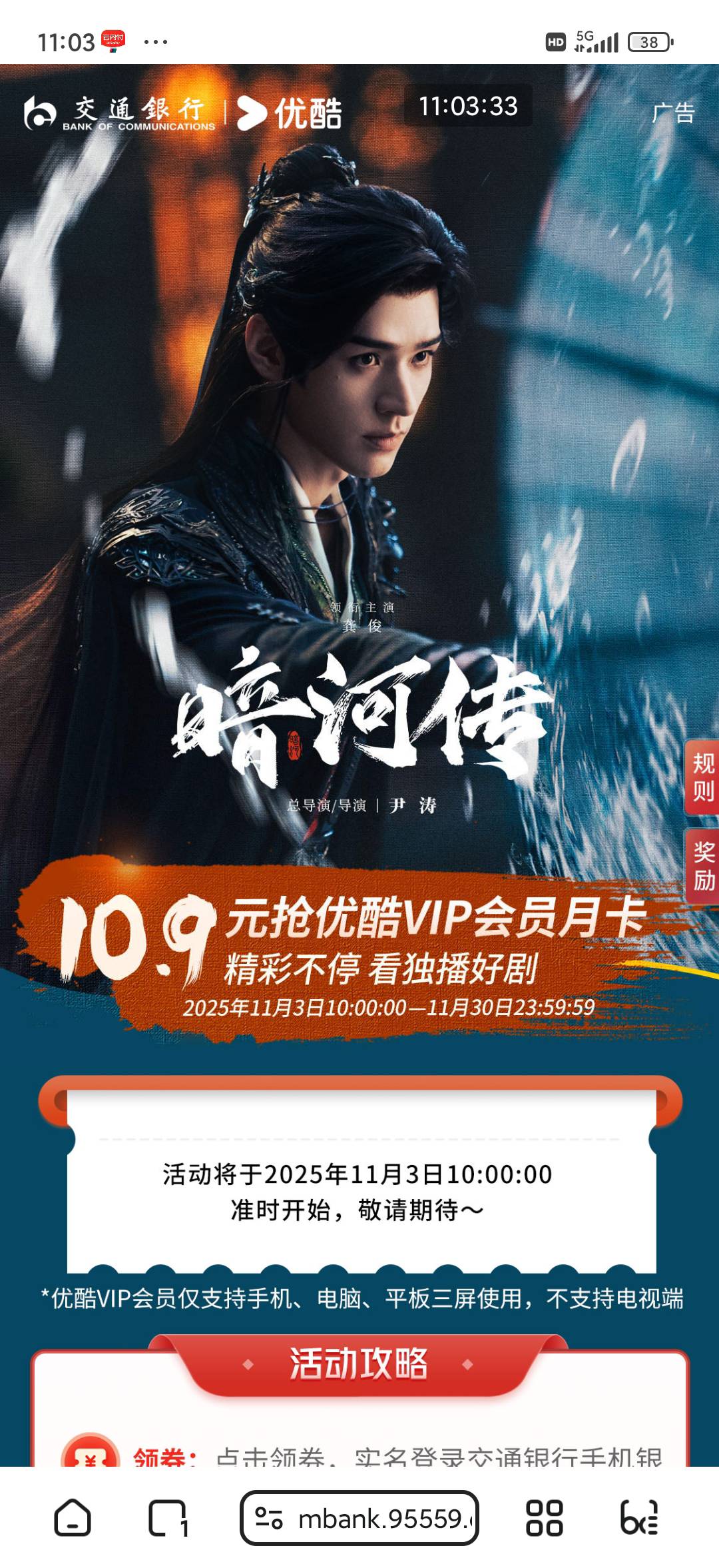 预告,交行储蓄卡领视频会员充值券,新一期,11月3号10点开始 优酷会员 https://mbank.95