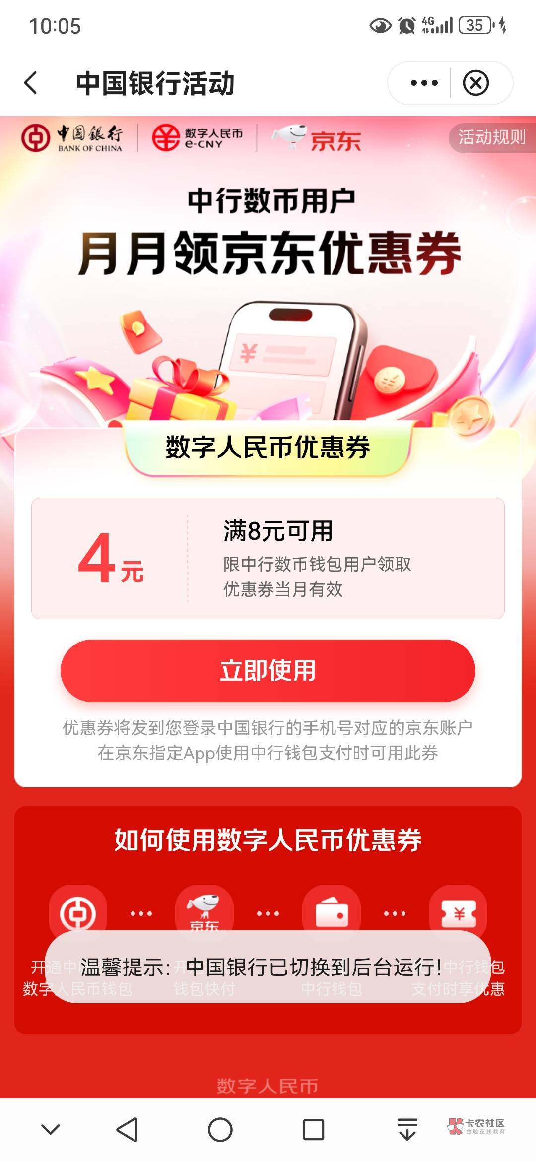 中行APP 搜京东超级省-月月领券-数币8-4??京东金融还款可用,京东app购物或外卖可用