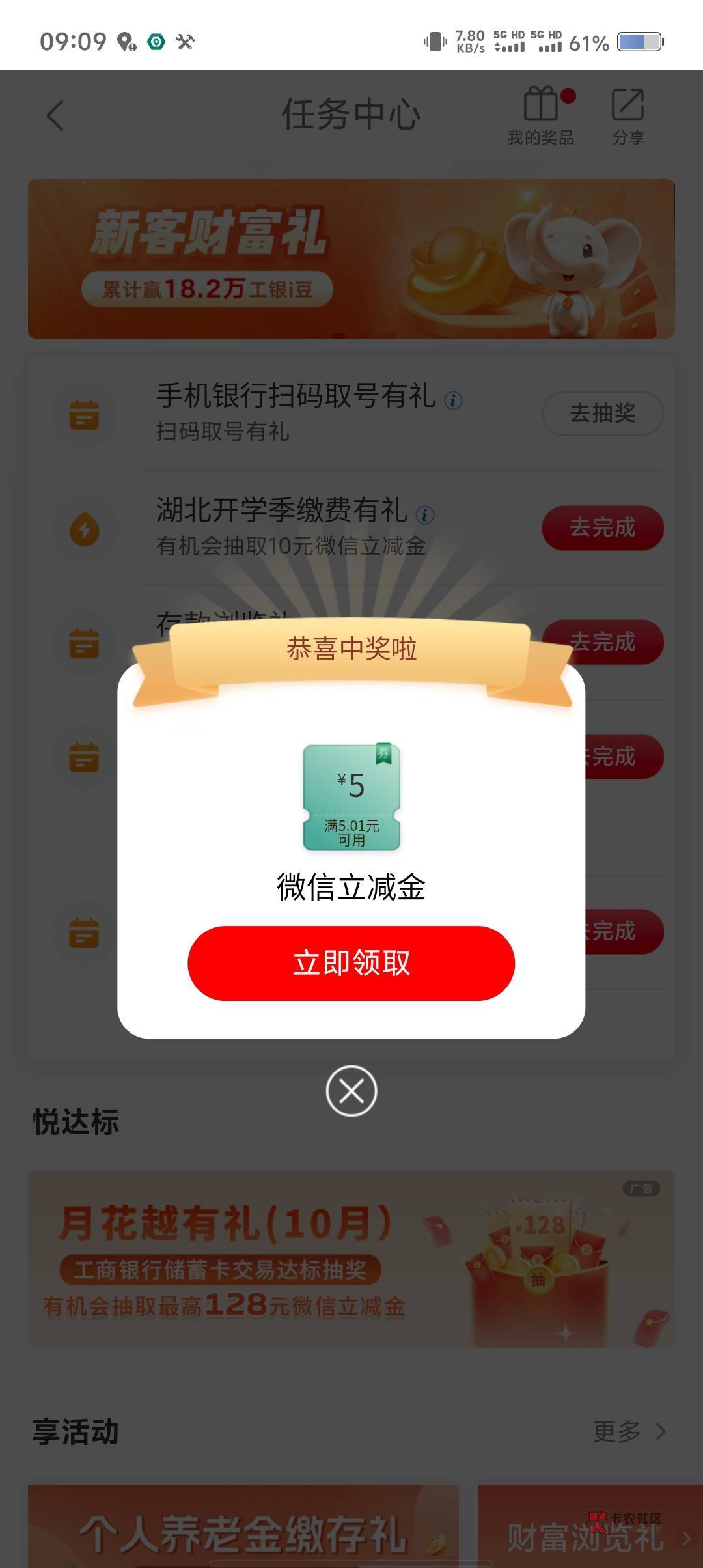 工行湖北任务中心扫码取号有礼活动