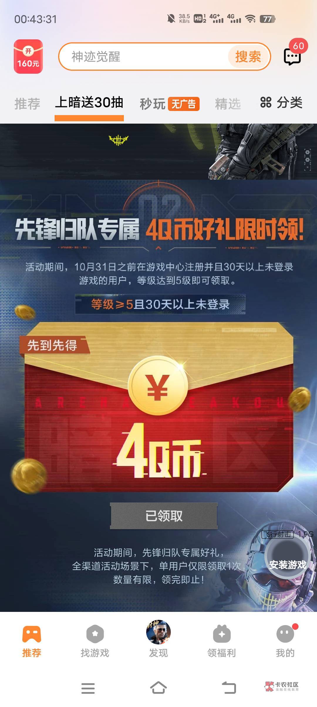 刚才vivo手机登录暗区的,再去游戏中心绑定账号领4qb