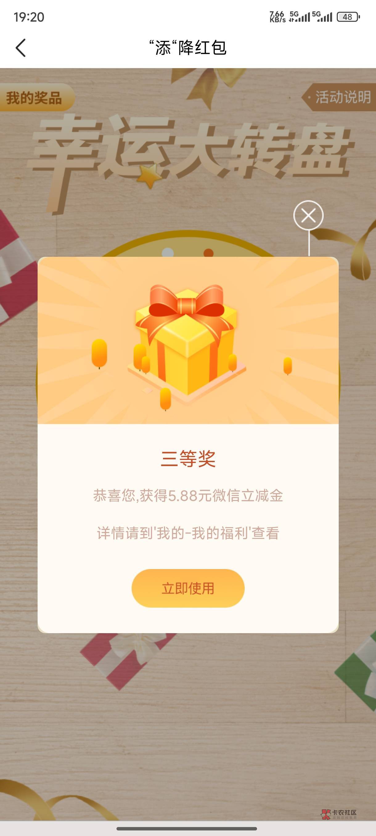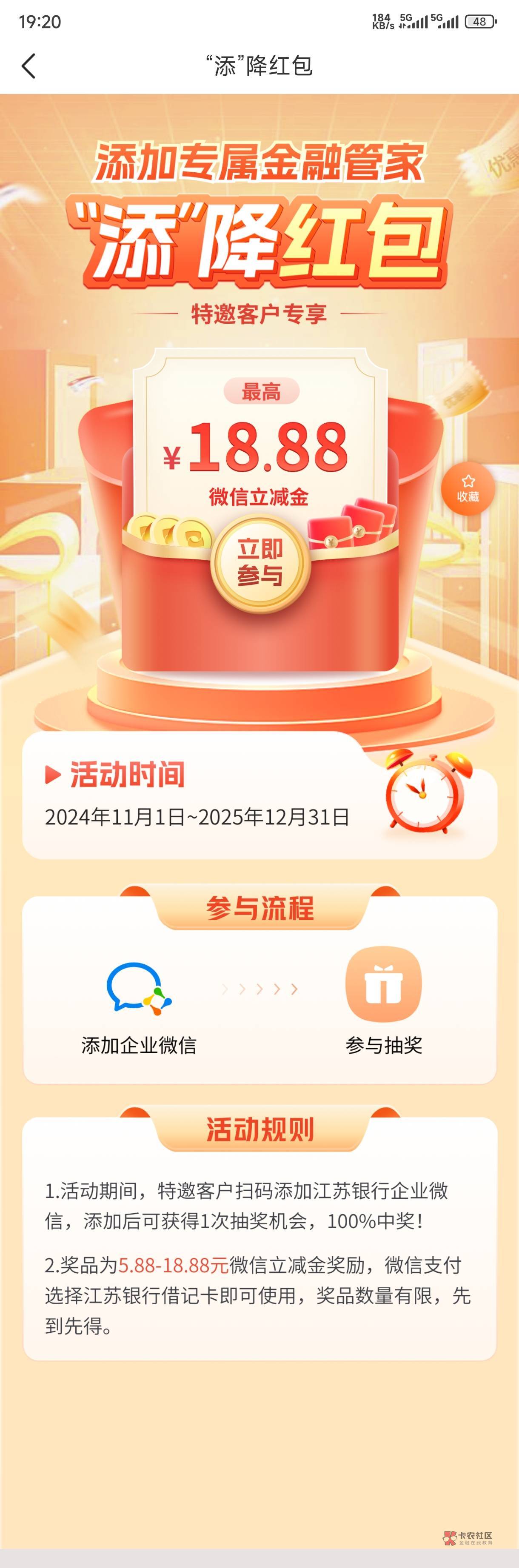 江苏银行特邀添加金融管家抽立减金,中了个低保