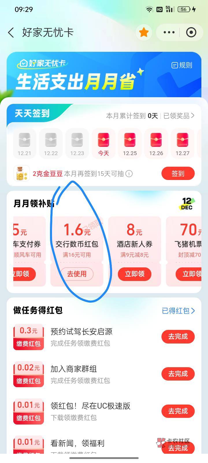 zfb搜索:好家无忧卡,无须消耗积分免费领1.6元交通数币红包!