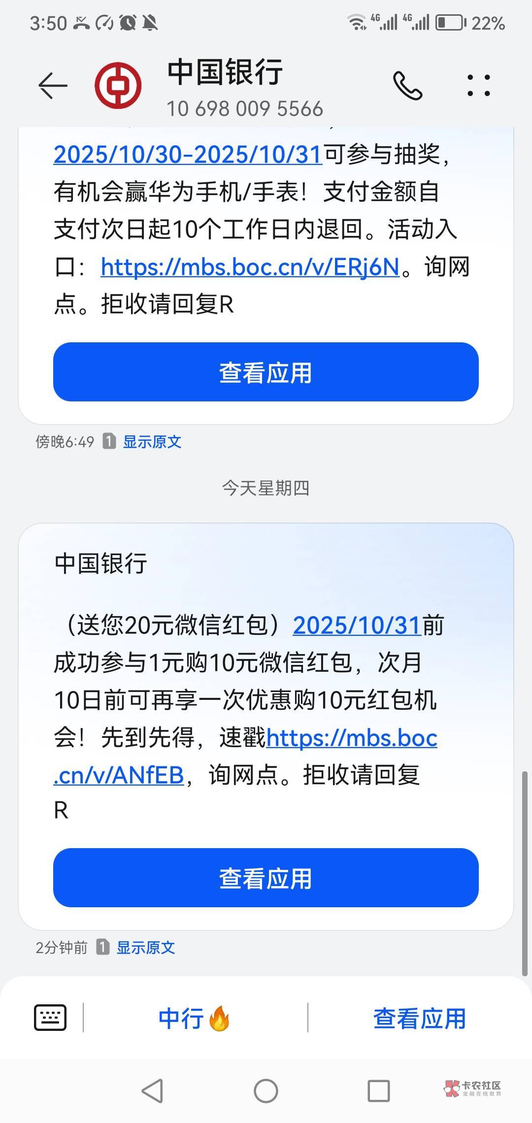 【中国银行】尊敬的客户,恭喜您获得5-20元微信立减金福利!登录中国银行APP-生活-城市服务-特邀专享,或者点击 https://mbs.boc.cn/v/a/JPYkI3Mm8t 直接参与,10月底前有效,转发无效,送完即止!拒收请回复R