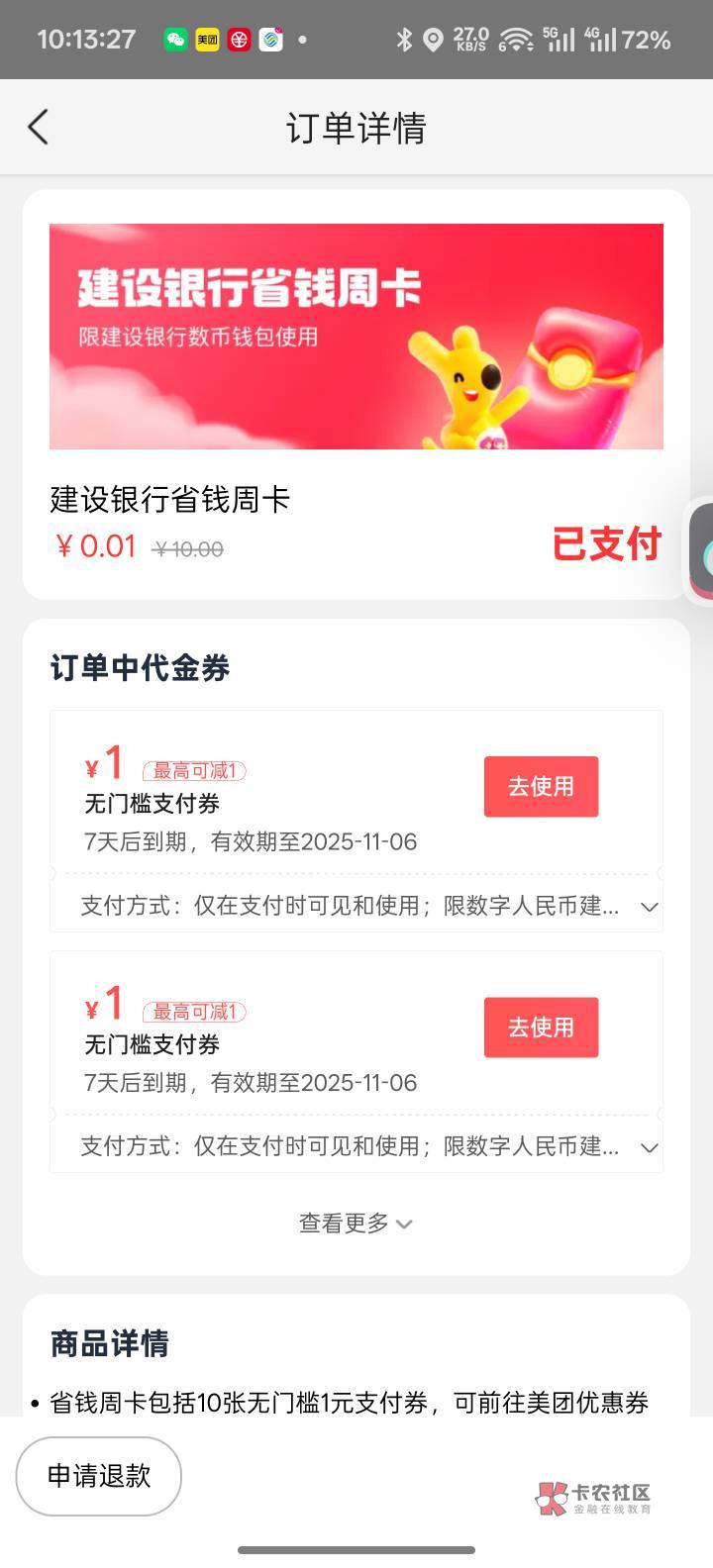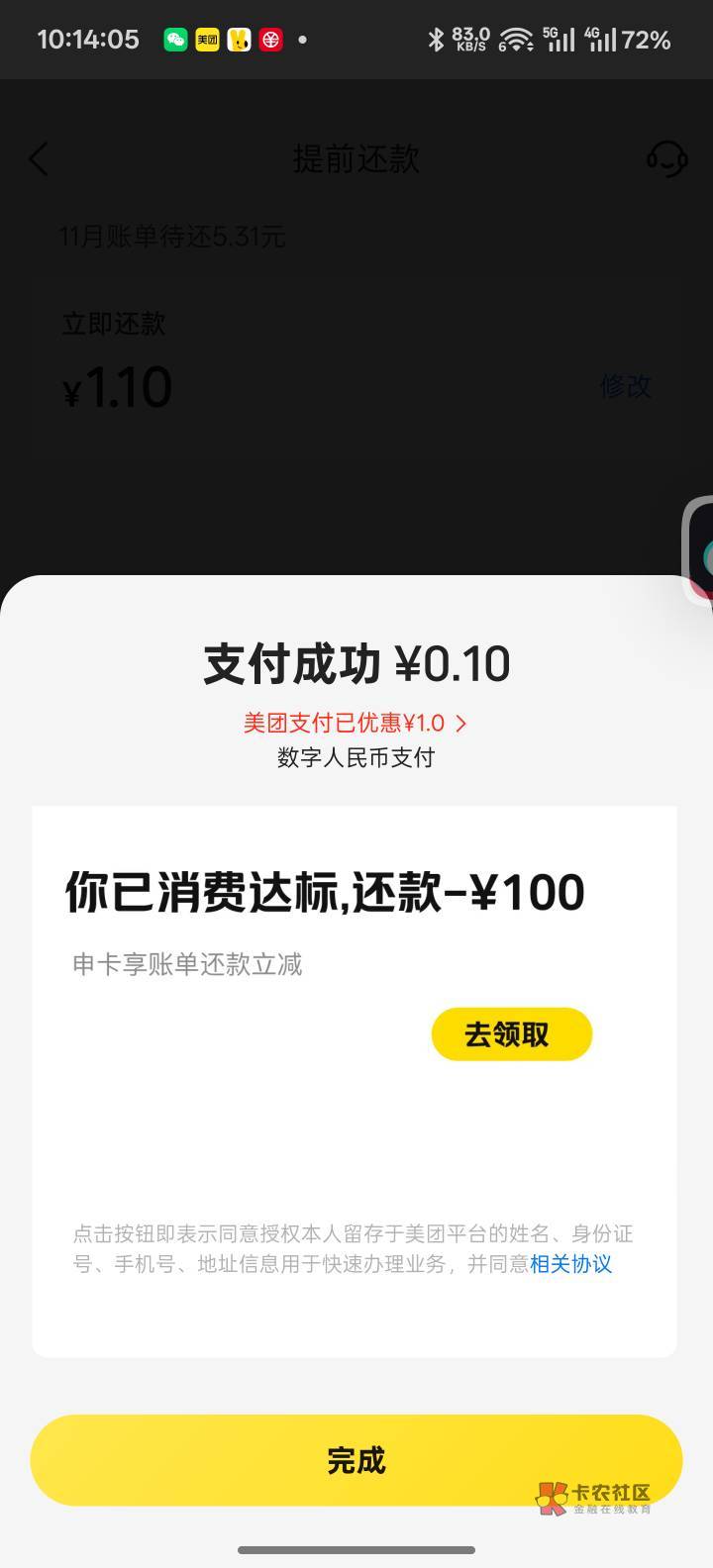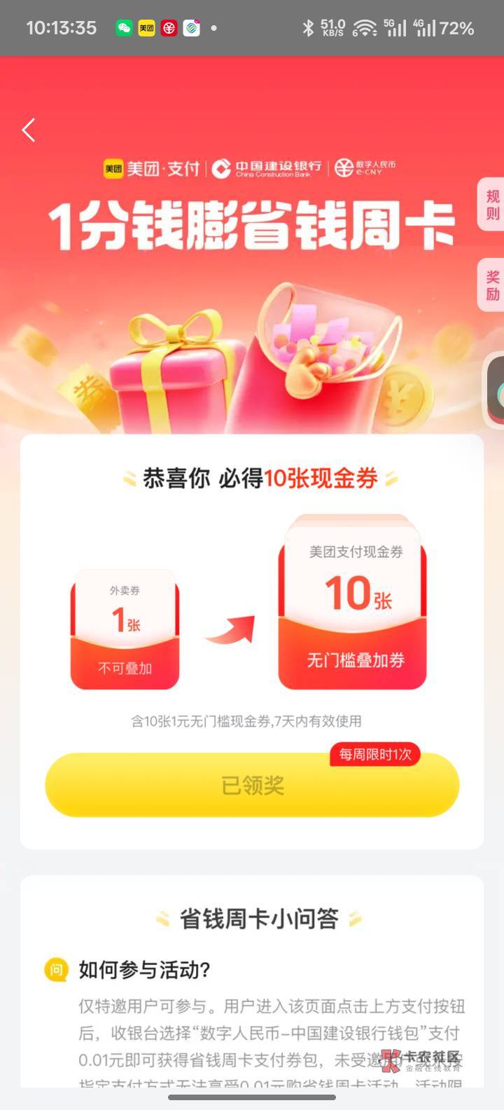 美团建行10毛省钱周卡,又更新了,上个星期领的又可以领,可以无门槛还月付,也能直接