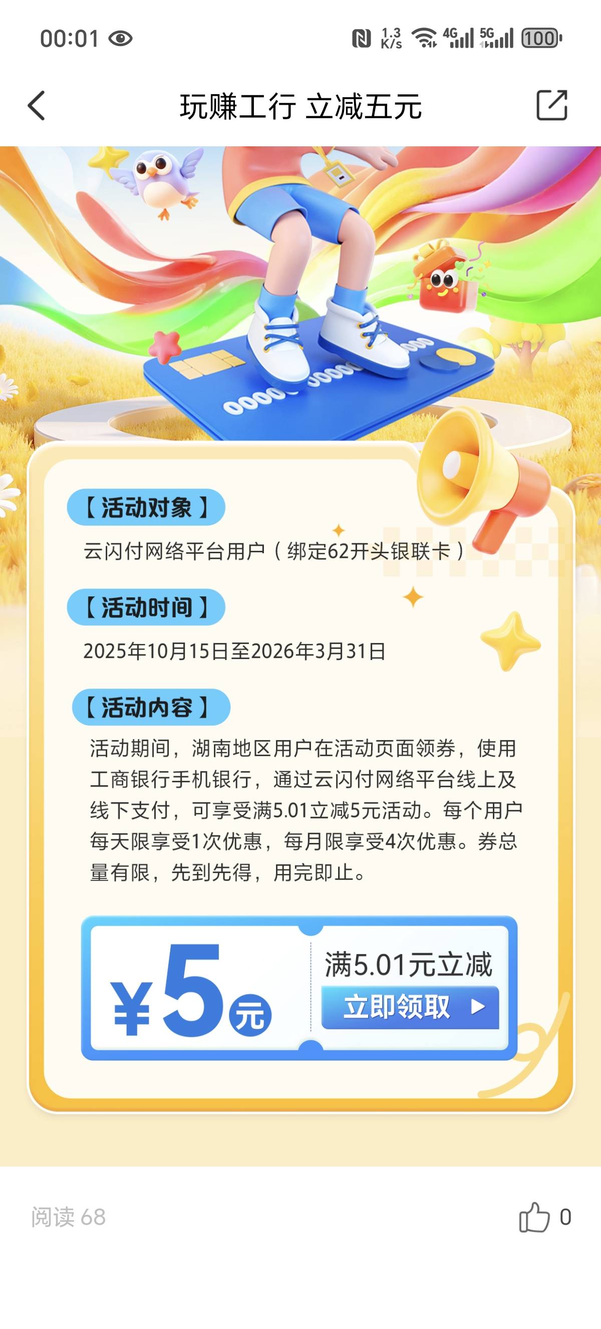 湖南地区云闪付点签到? ?有个每日核销工行券活动??进去领5元券??