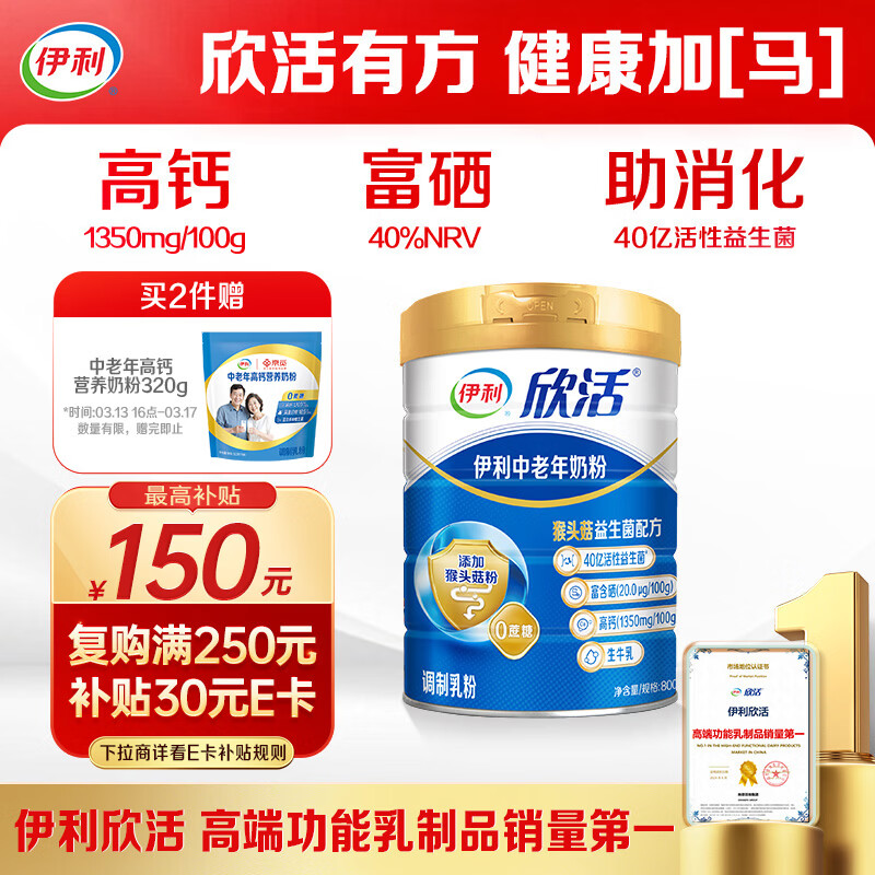 先领50-10卷 伊利 欣活高钙富硒奶粉800g 60.9亓自营包邮,