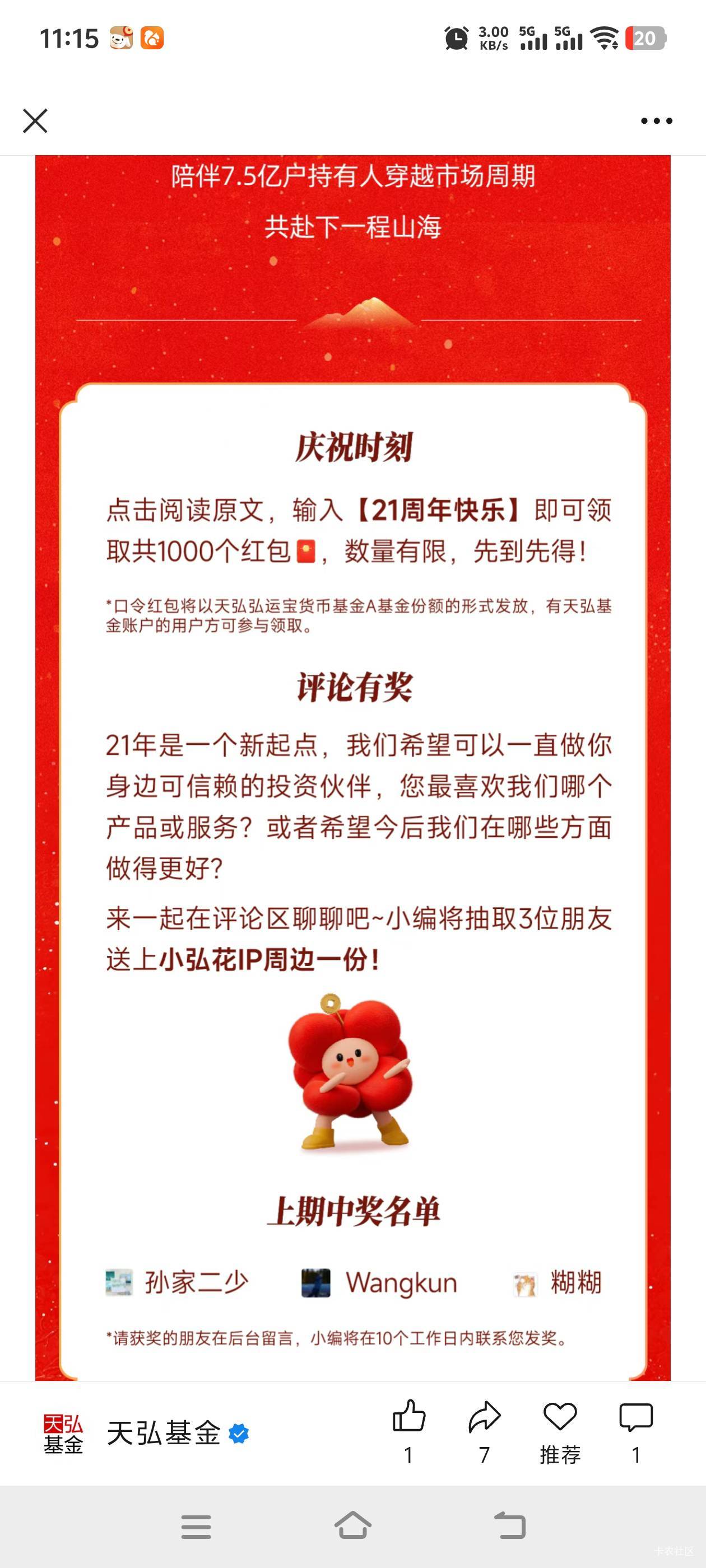 天弘基金公众号最新推文,点阅读原文,输入21周年快乐,1000个红包