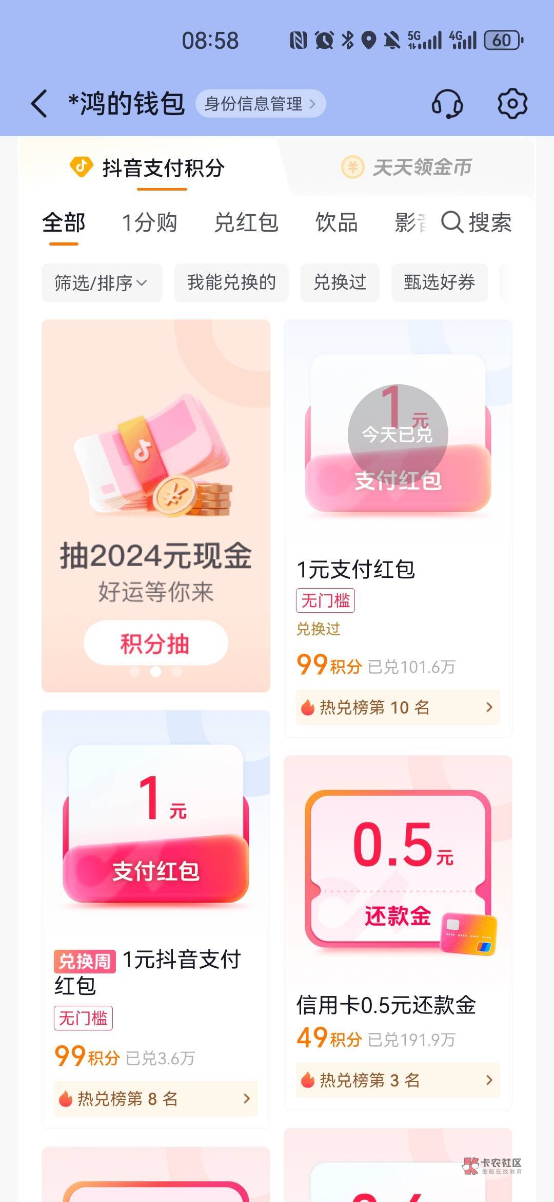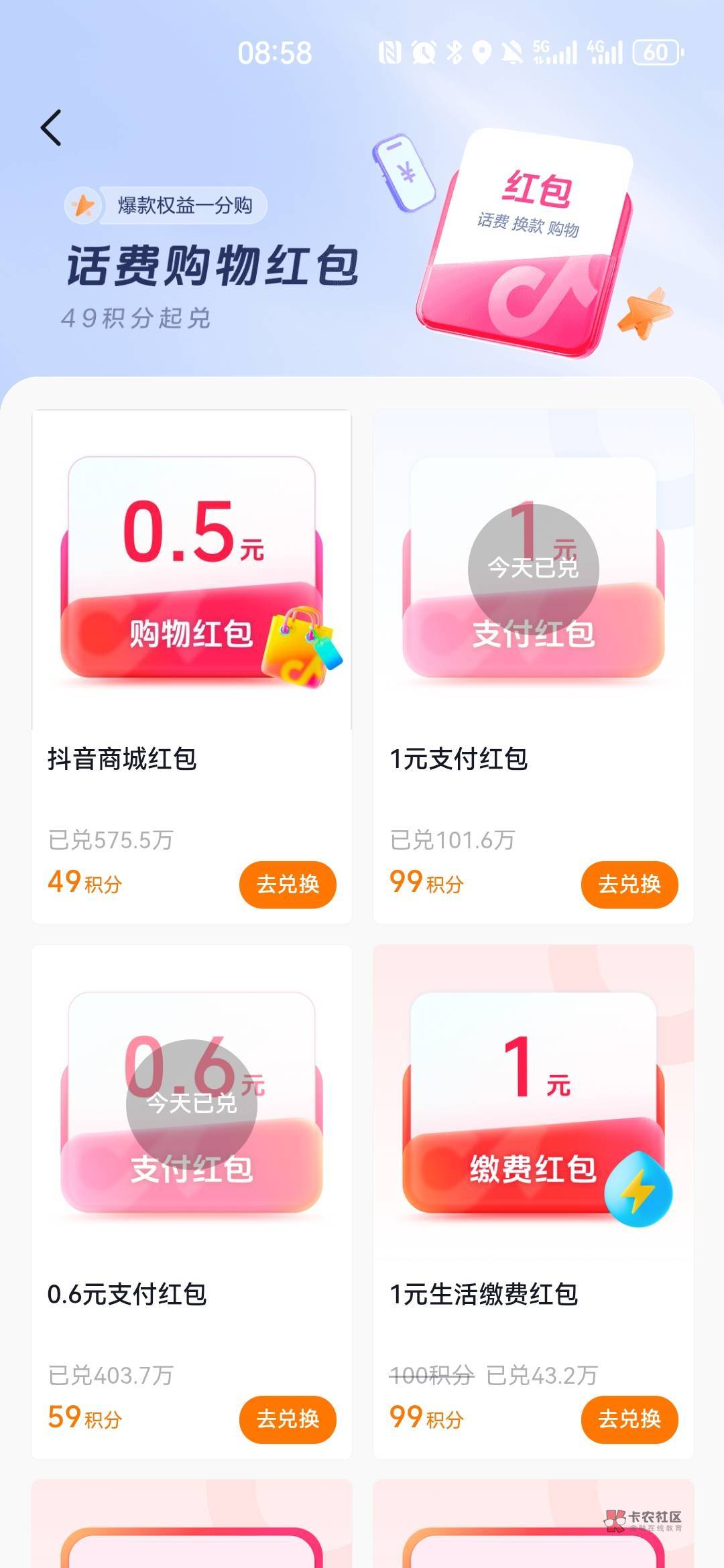 抖音有积分的可以去兑换,1+1+0.6红包