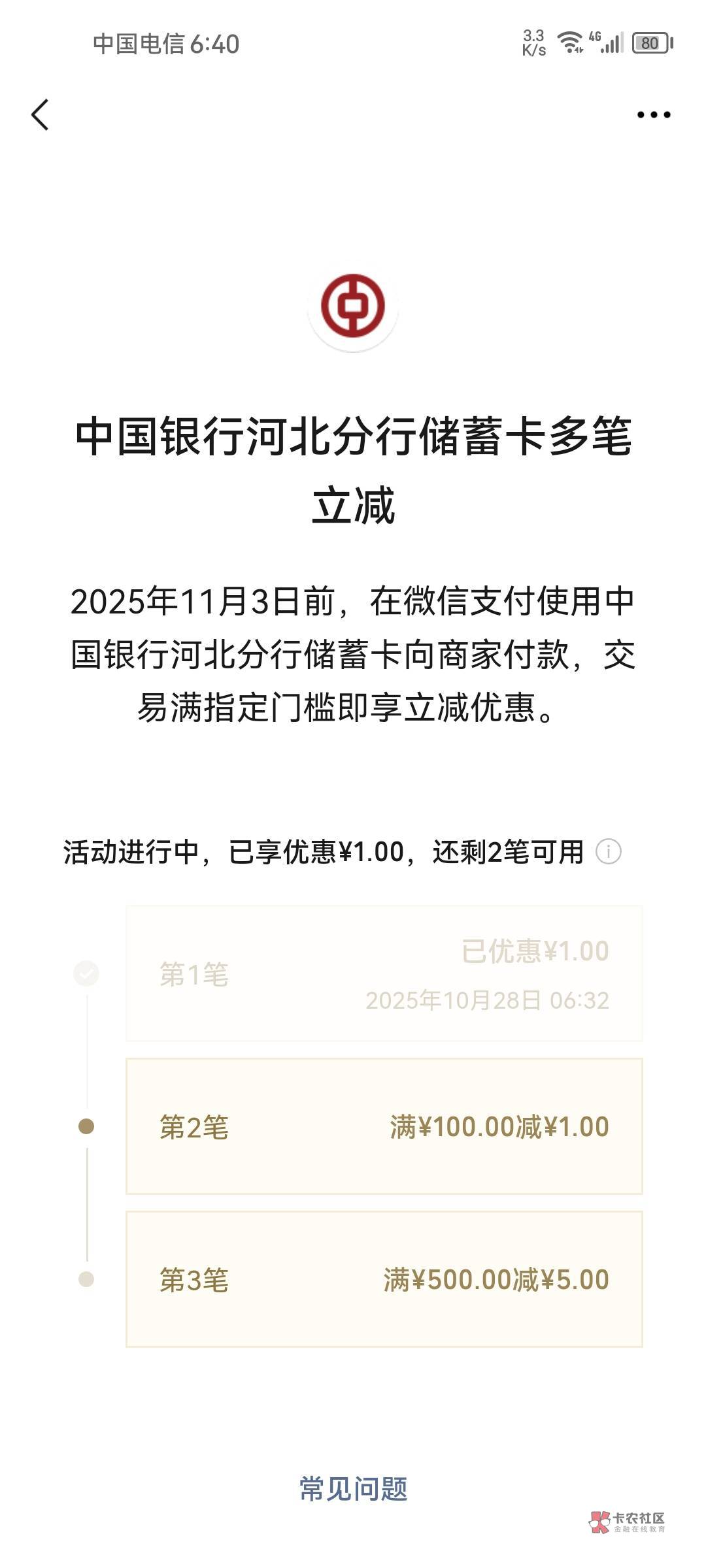 中国银行河北分行储蓄卡多笔立减