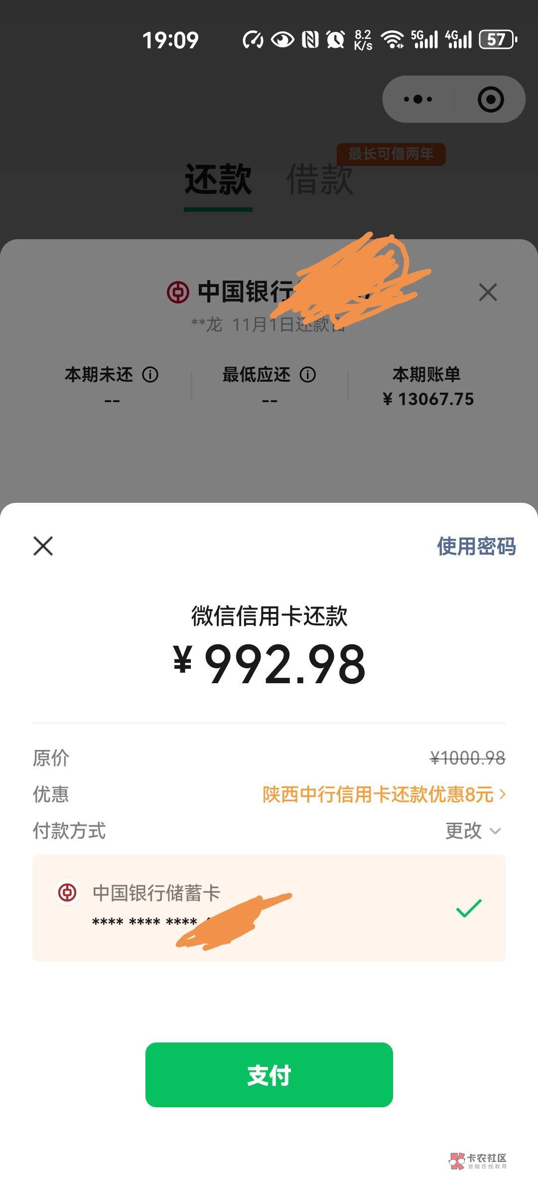 陕西中行微信信用卡还款还有个1000-8,不知道几次,卡限额了