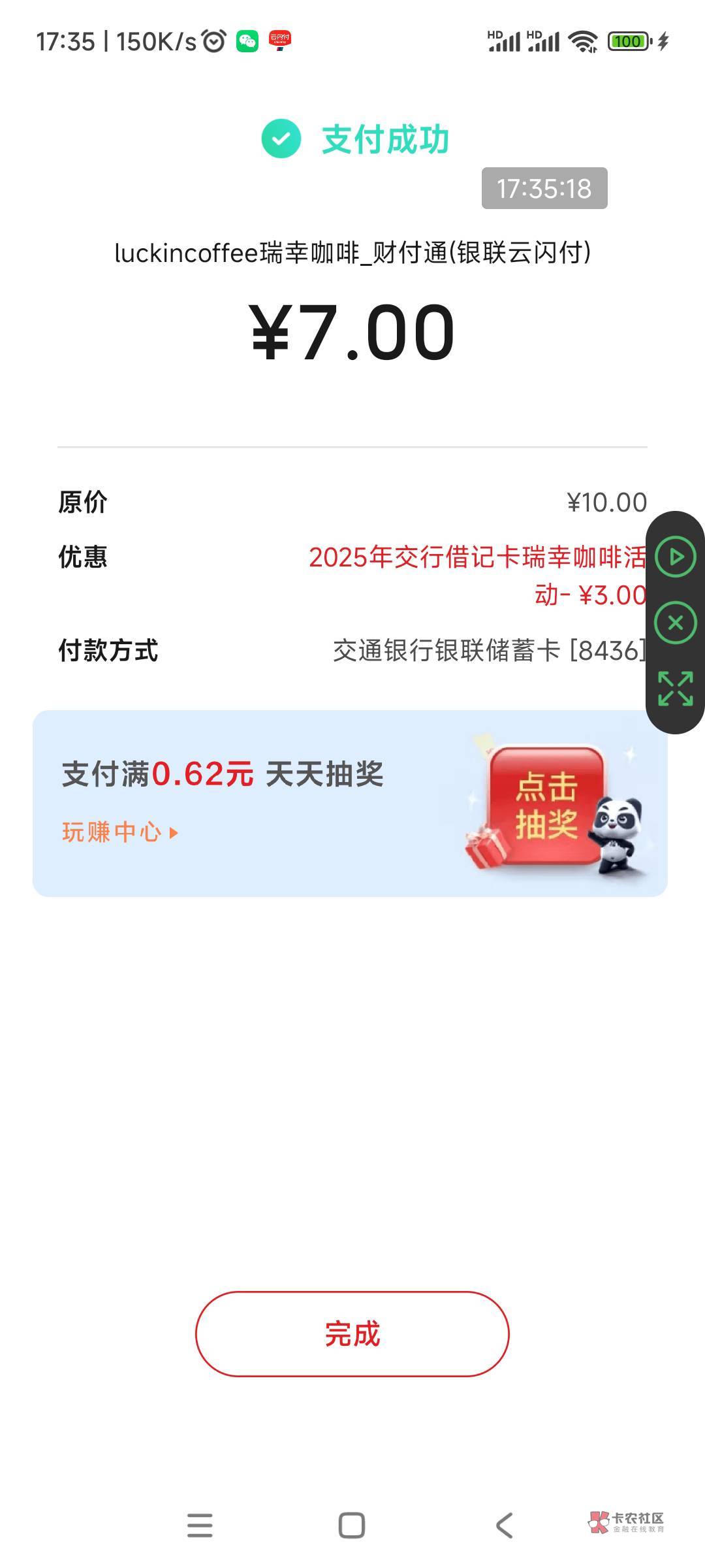 微信瑞幸咖啡小程序,买10现金卡,跳转云闪付支付交行10-3,一般老板都是8.5折以上收,此贴不做回复,仅供参考。