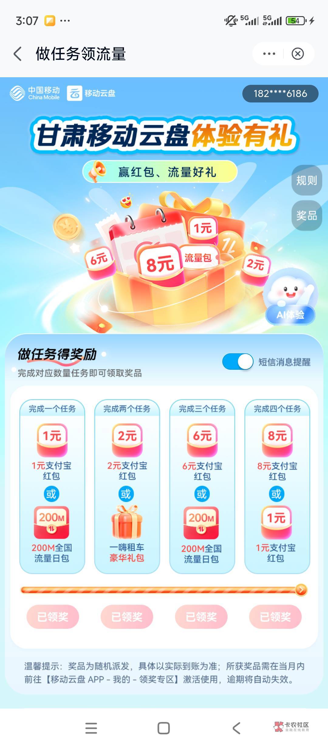移动云盘,首页体验有礼,做4个超简单任务,17毛支付宝红包 ...