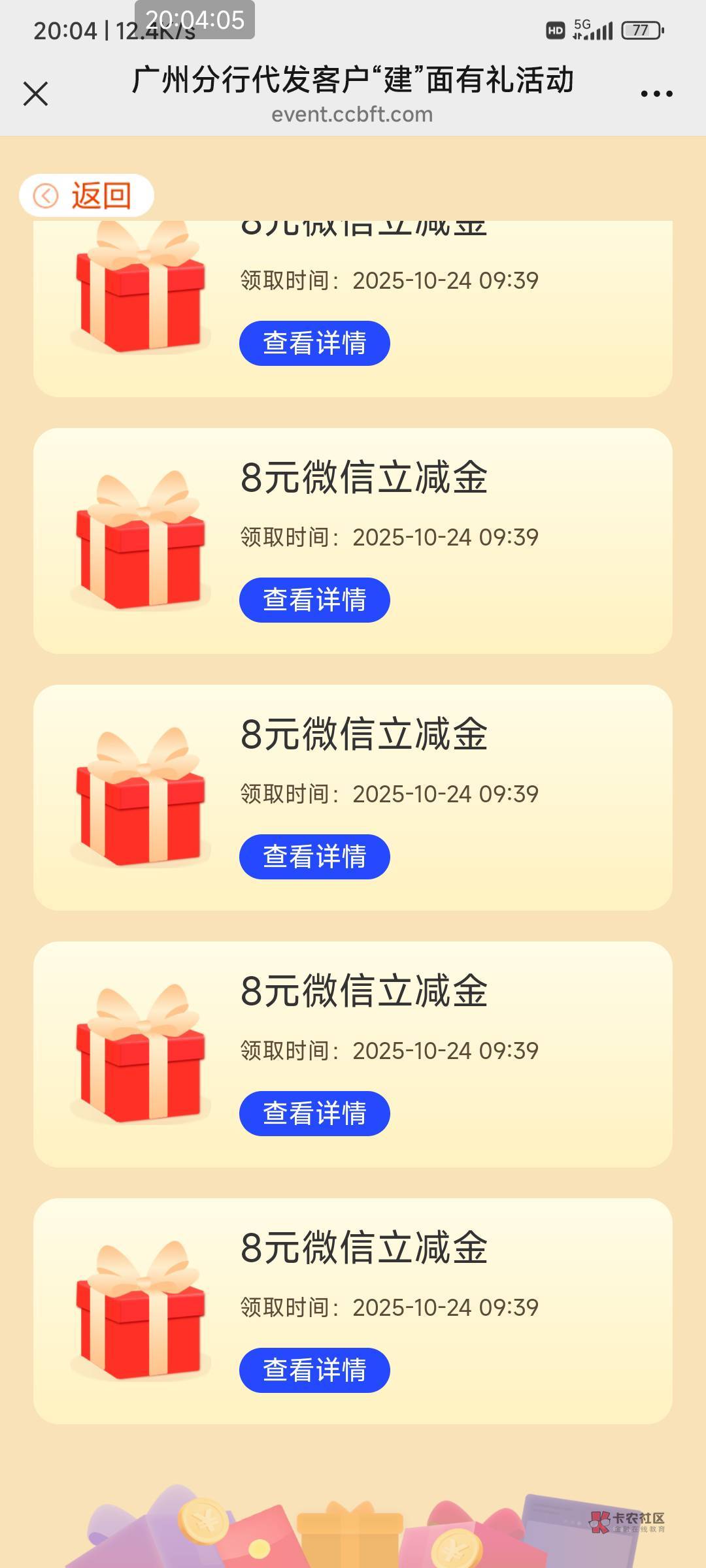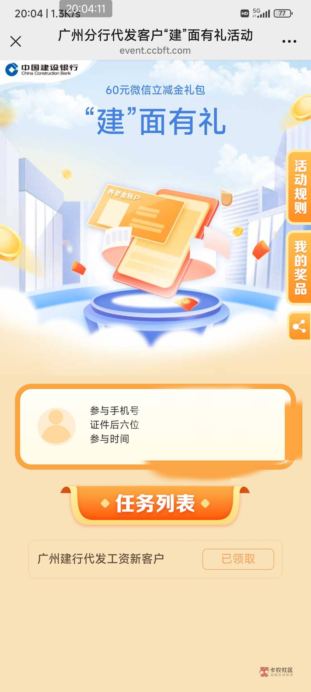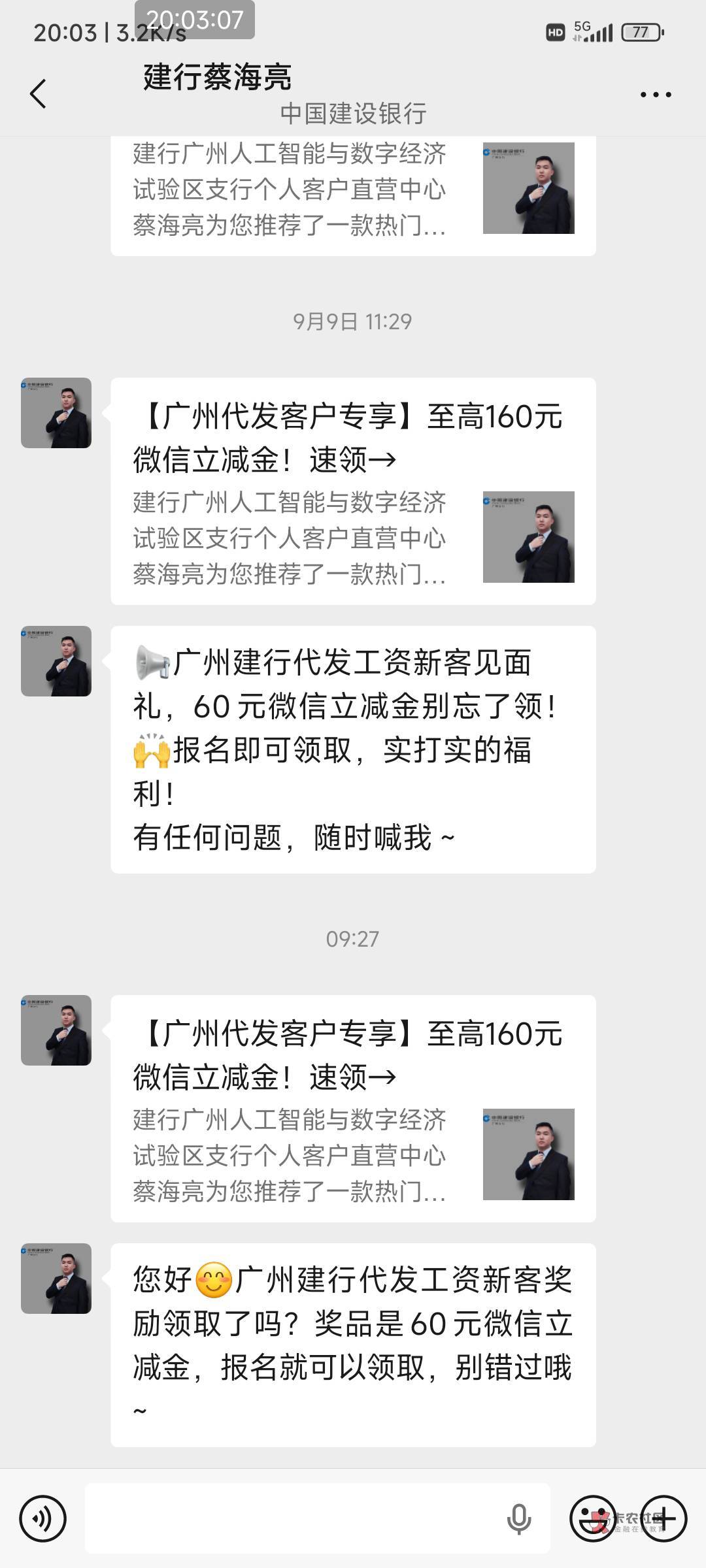 广州建行代发60大毛,我都没有广州建行卡,手机银行也从来没有注册过广州的。就是之前去激活深圳建行卡在网点扫码加的企业号(卡是网上申请寄过来的深圳一类卡,激活是在广州网点),发了两三个月代发链接了,以为假的,从来也没有点进去过,今天看到又发来就随便点进去居然可以领取60毛代发,卡也不是代发。不过之前用V商家码转账到卡里注明过工资。真奇怪。