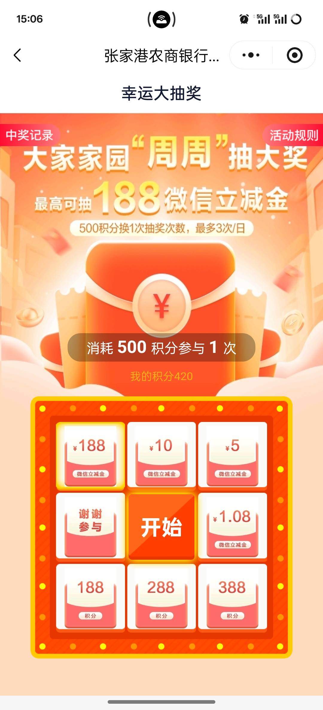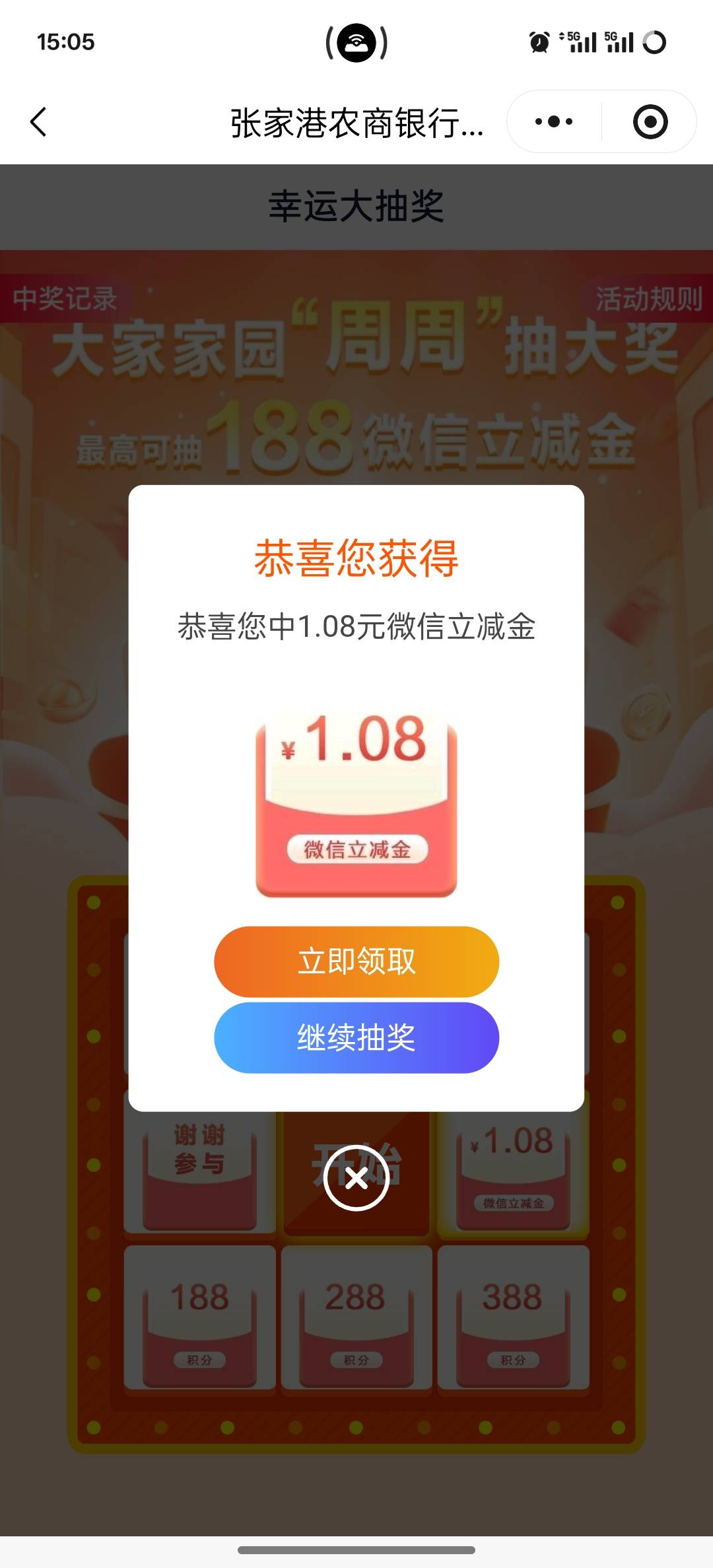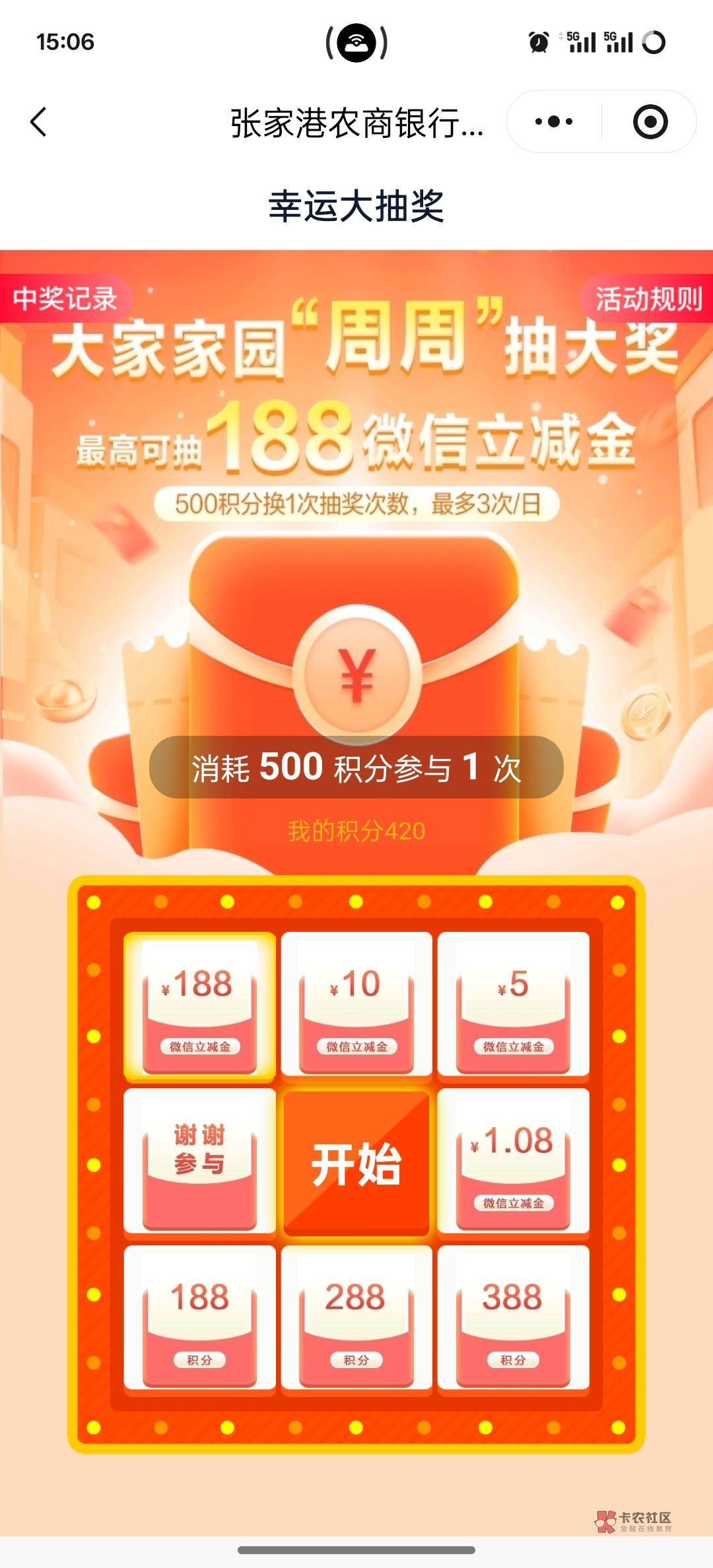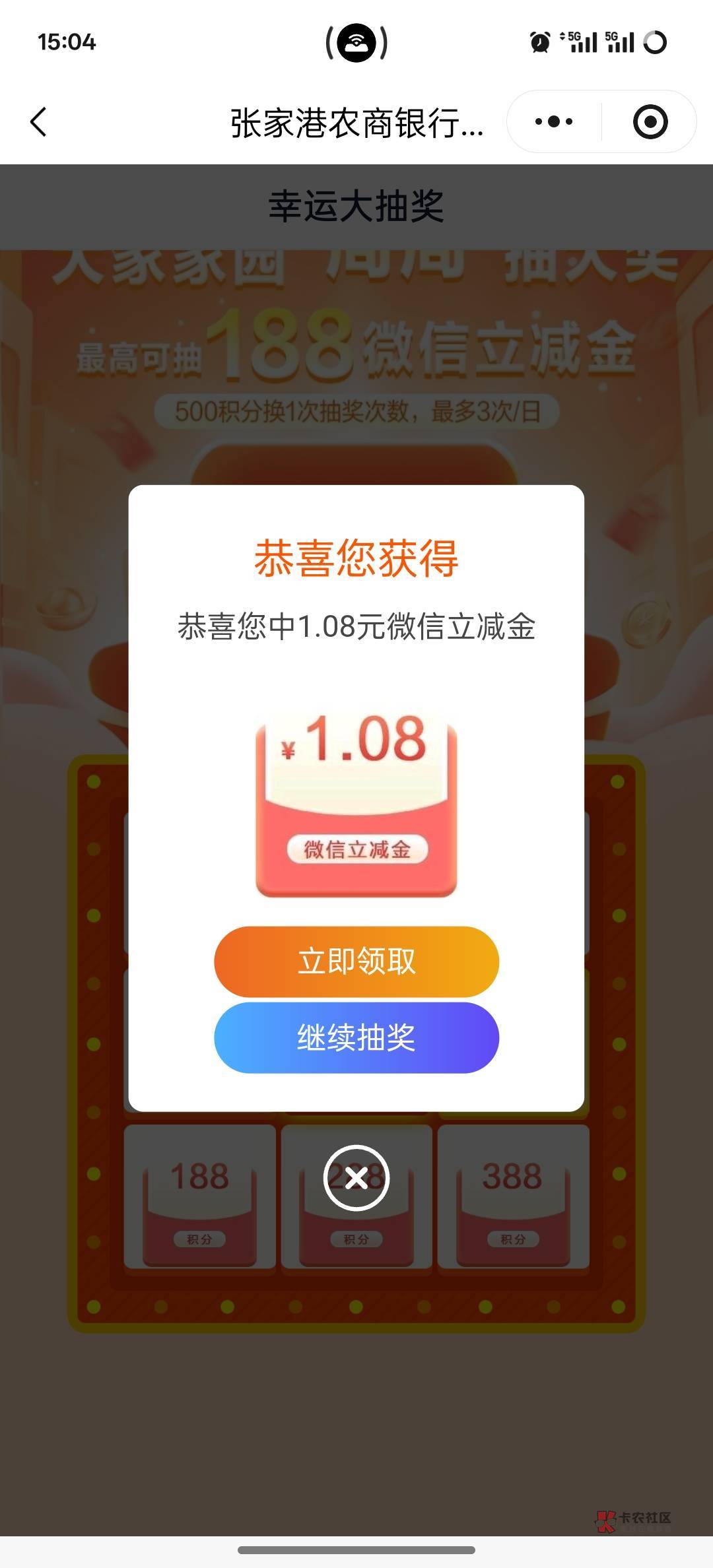 大家家园小程序,注册完实名认证送1000积分,积分可以换卡券,可以抽奖,抽奖保底1.08