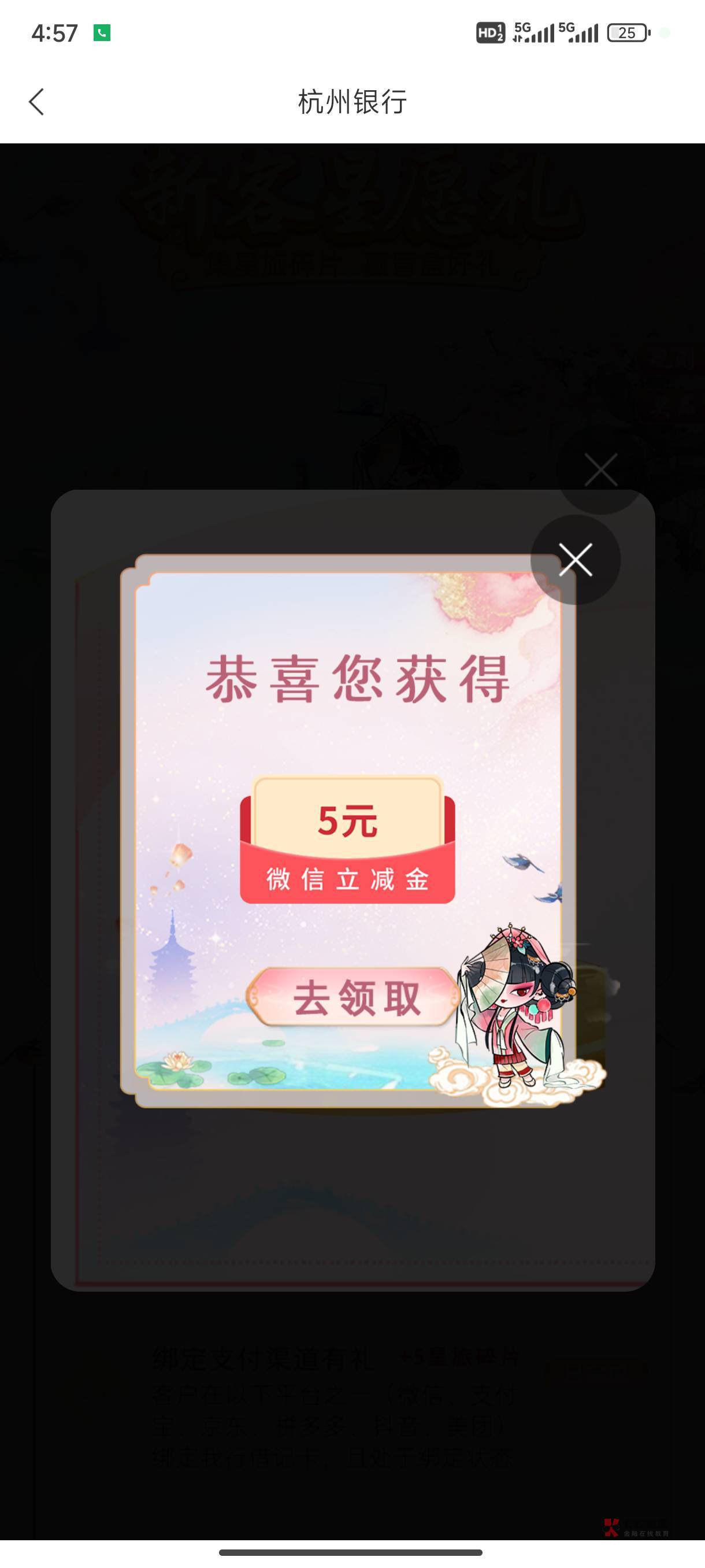 杭州银行,微信绑卡有5立减,新客星愿保底5立减,杭州银行福利社小程序保底1.88。