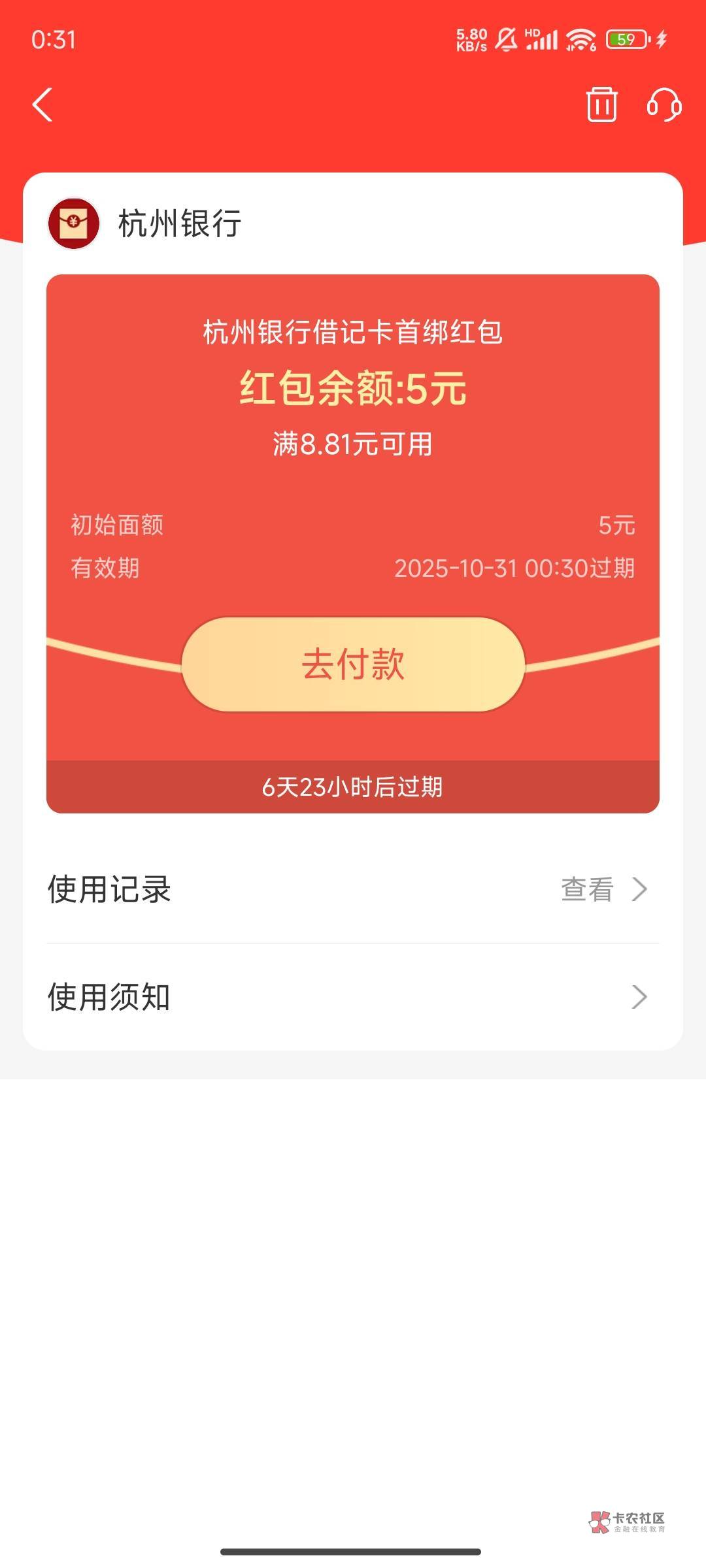 杭州银行的卡重新绑新支付宝有5红包 我卡好久之前开的绑过支付宝了
