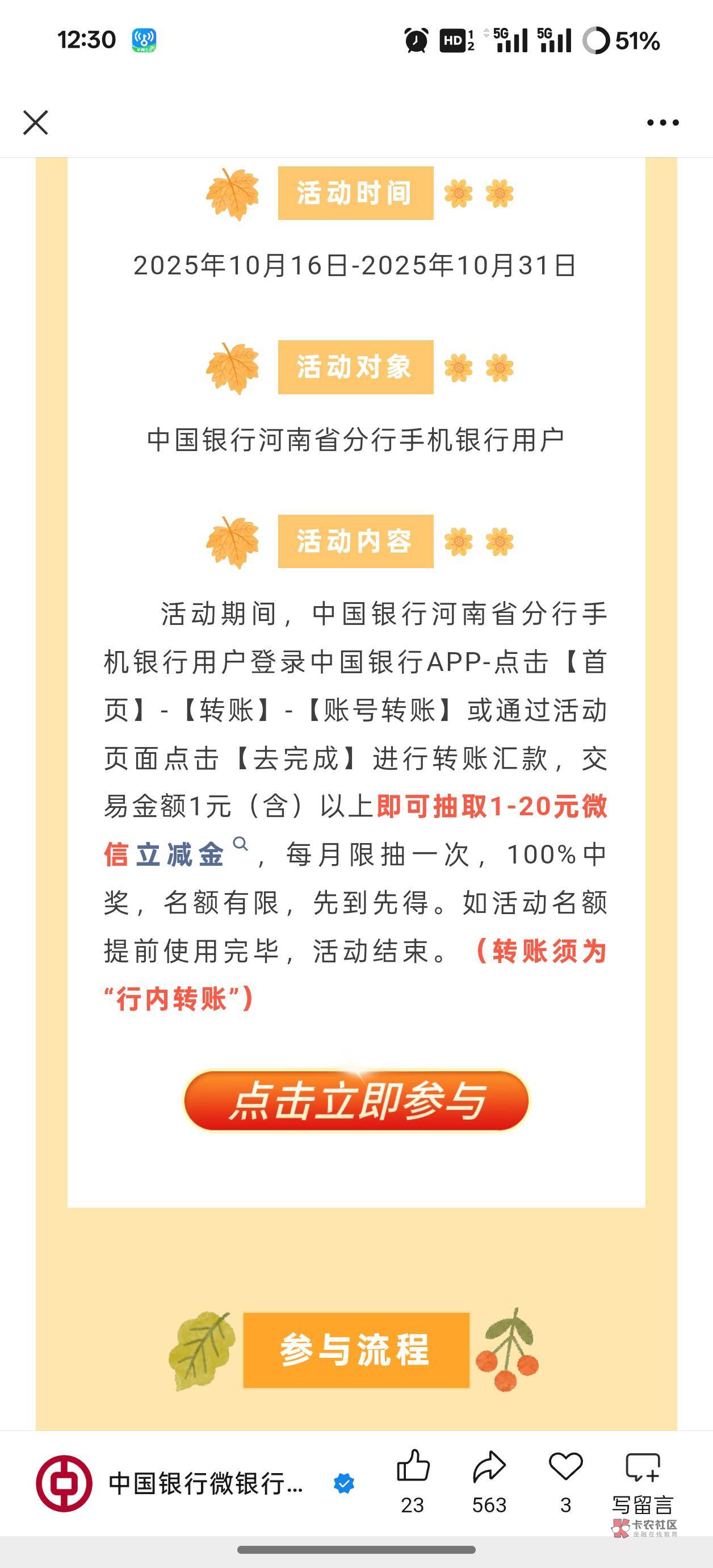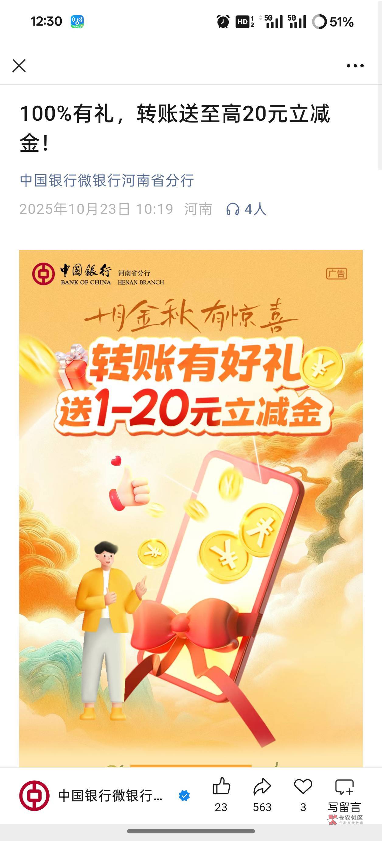 中行河南 转账抽奖 规则说大概率中1-20 我没卡 老哥们有卡的去试试呗