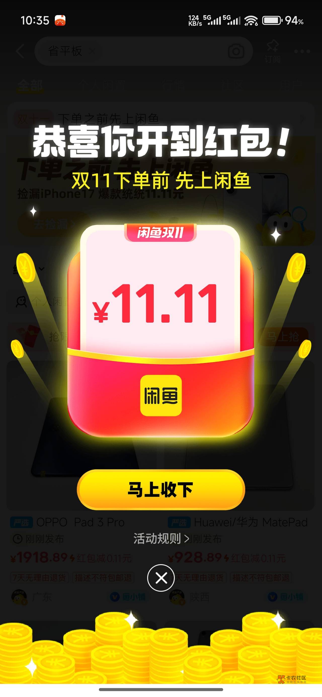 闲鱼搜索 (省平板)(神奇彩蛋) 每个搜索有5次抽奖机会??不中就退出??重新搜索 大小号上链接可以T