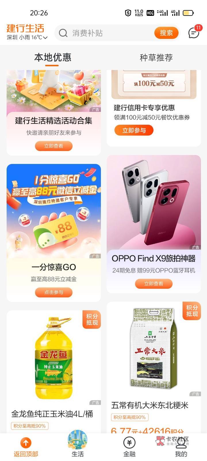 建行生活,选深圳,本地优惠,一分惊喜。抽立减金,保底2