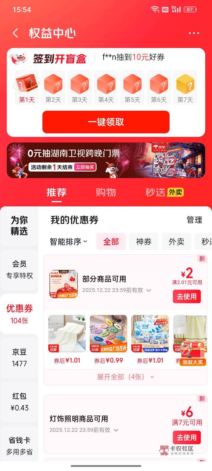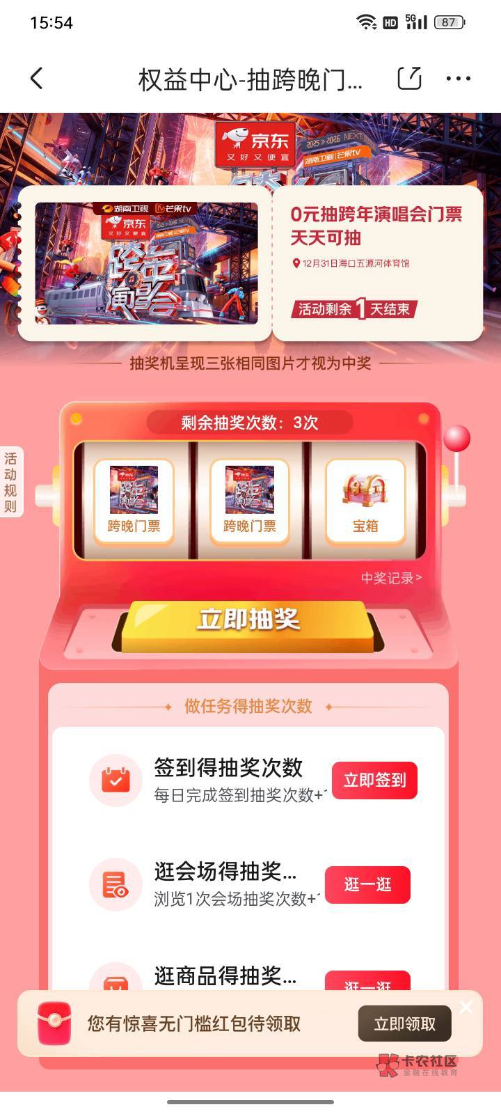 京东抽跨晚门票,最后一天。权益中心进去。 ...