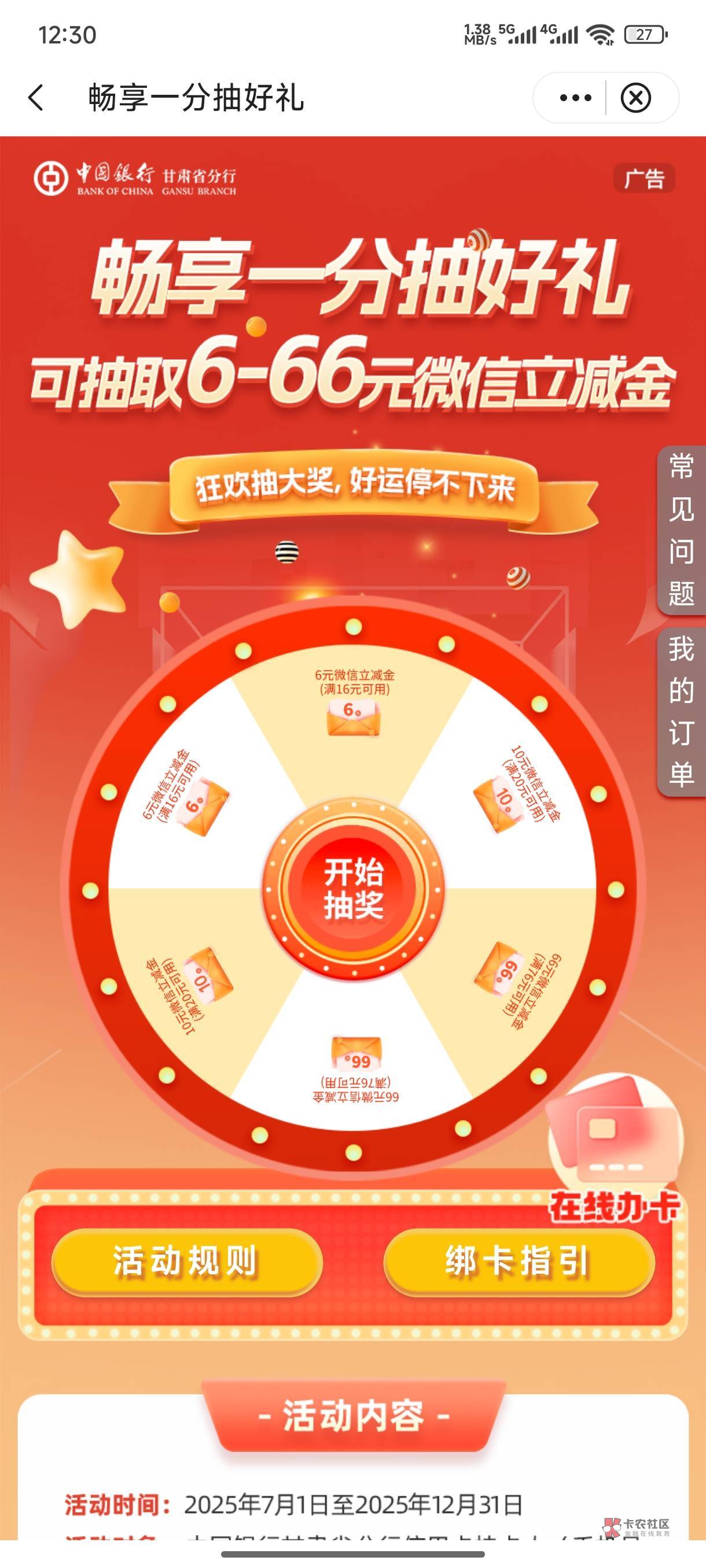 飞了甘肃中行的,这个活动也可以抽,限有信用卡的,信用卡不限地区,前几年办的中行乡村0额度卡也能用,保底6