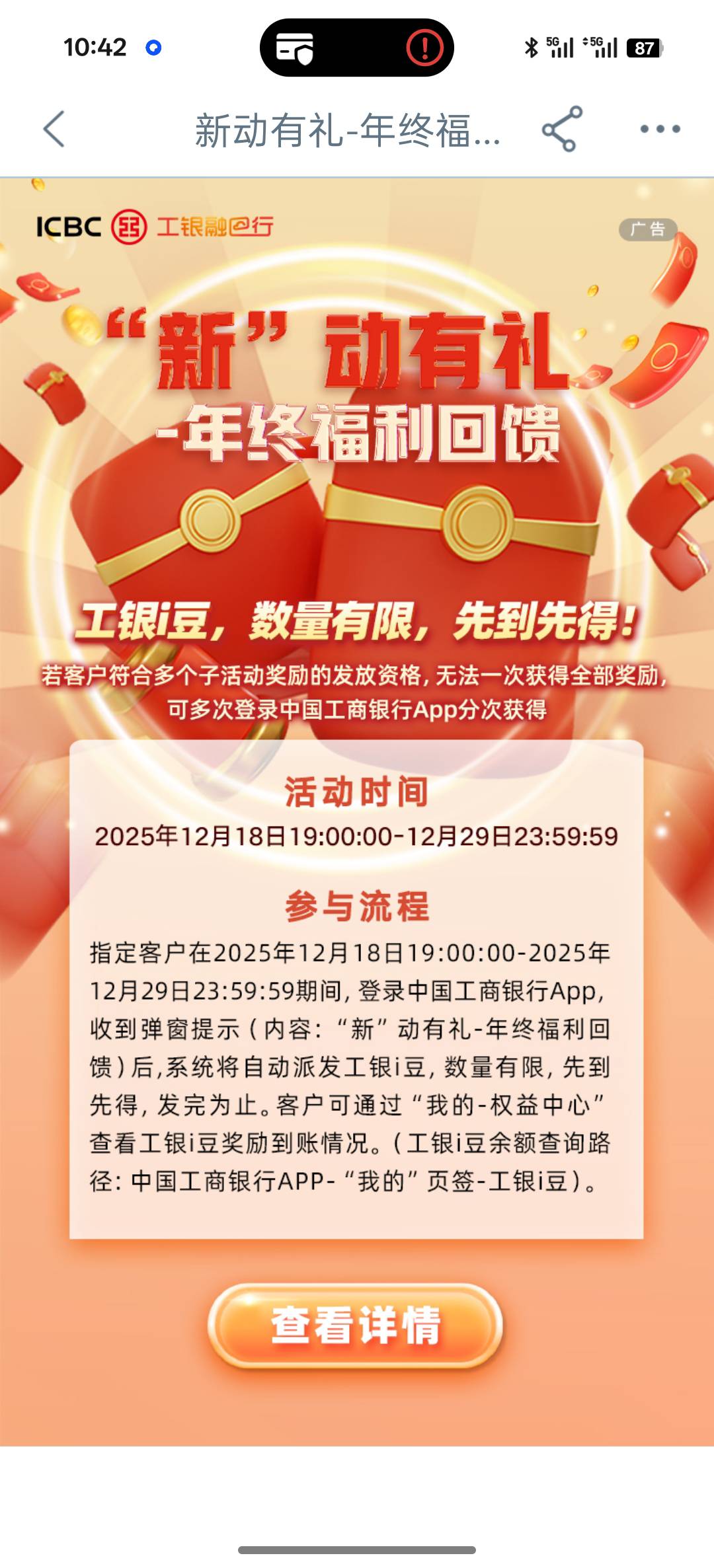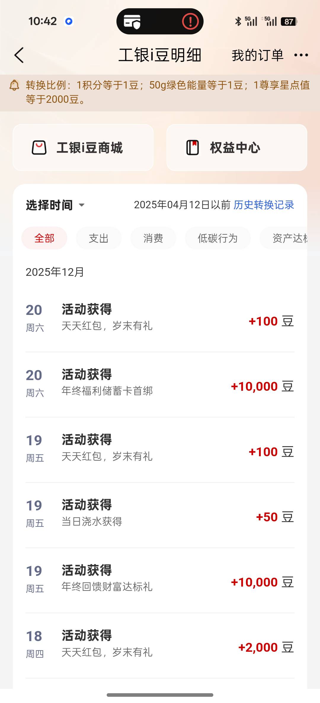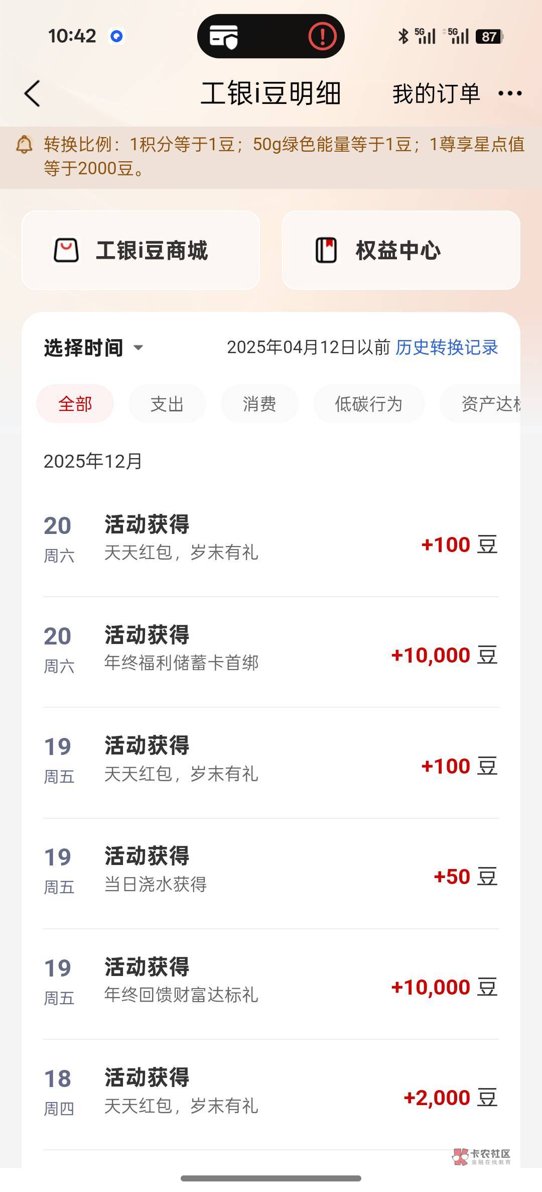 工行年终福利,一天一万豆,能兑换一个十块的e卡,登录app就有