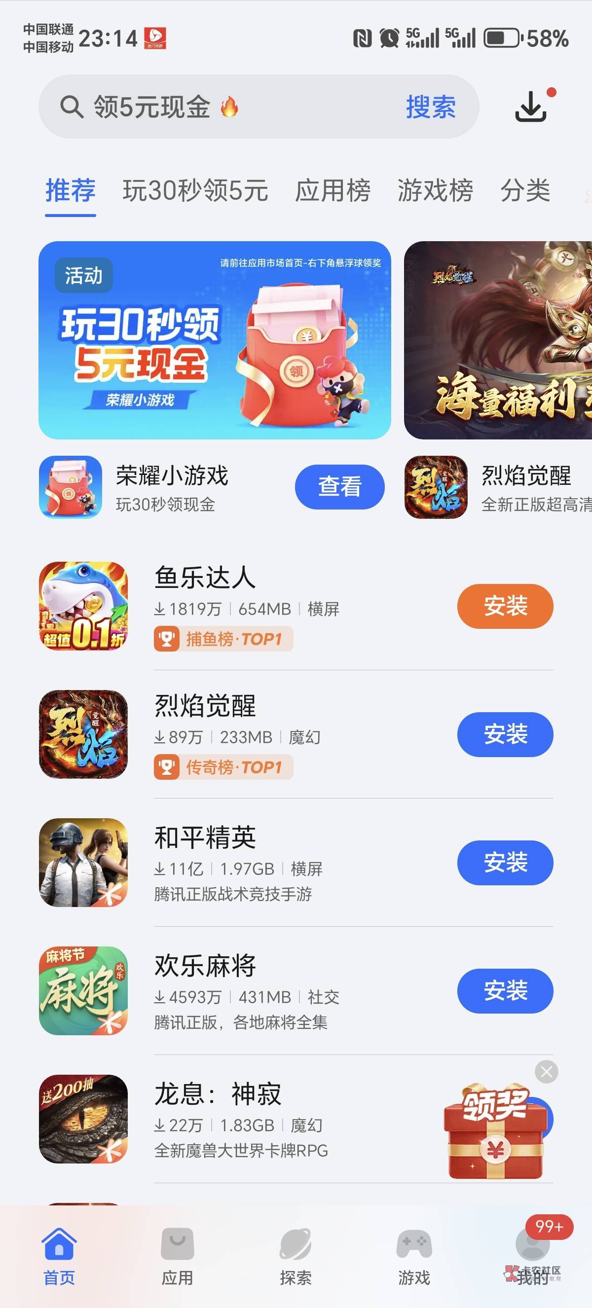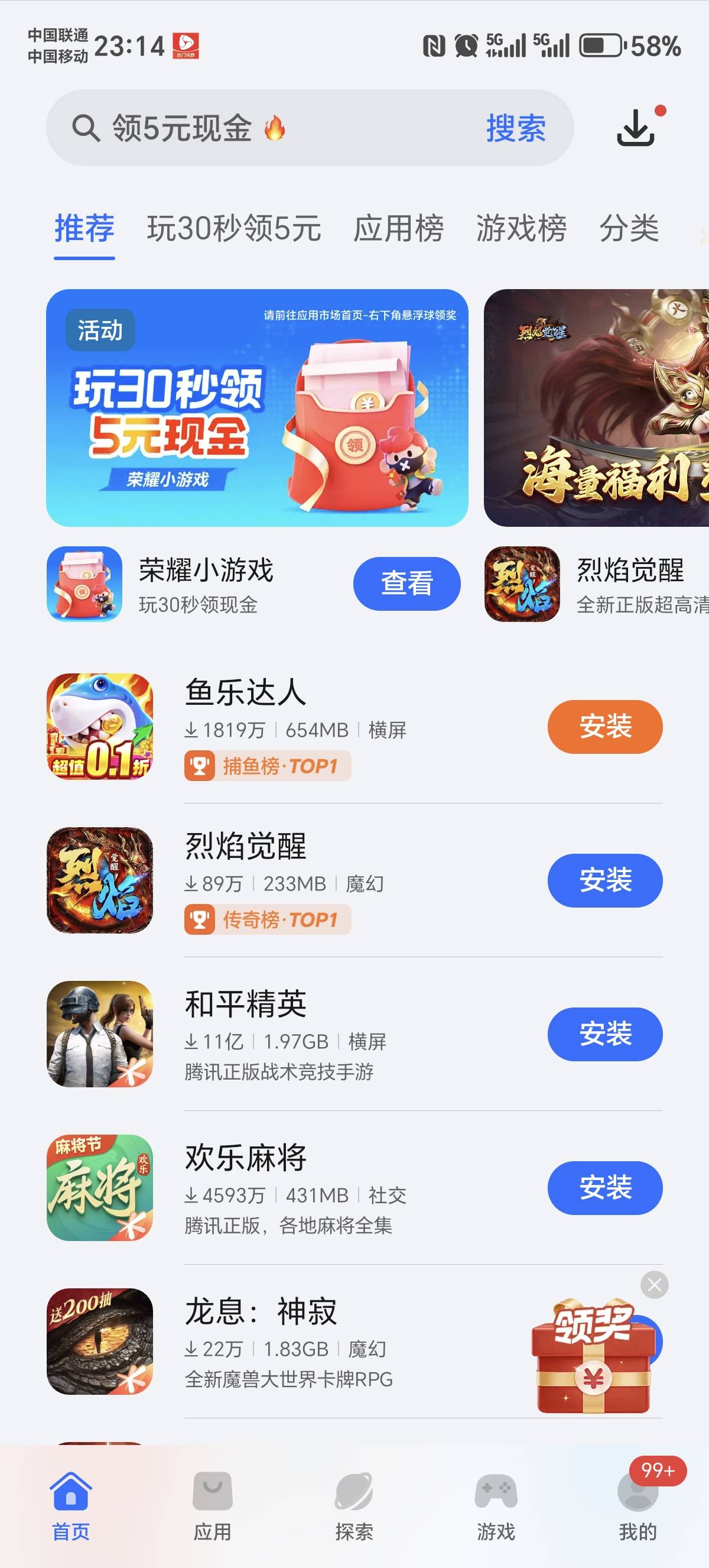 荣耀手机应用市场玩小游戏30秒提5元活动,简简单单赚5毛