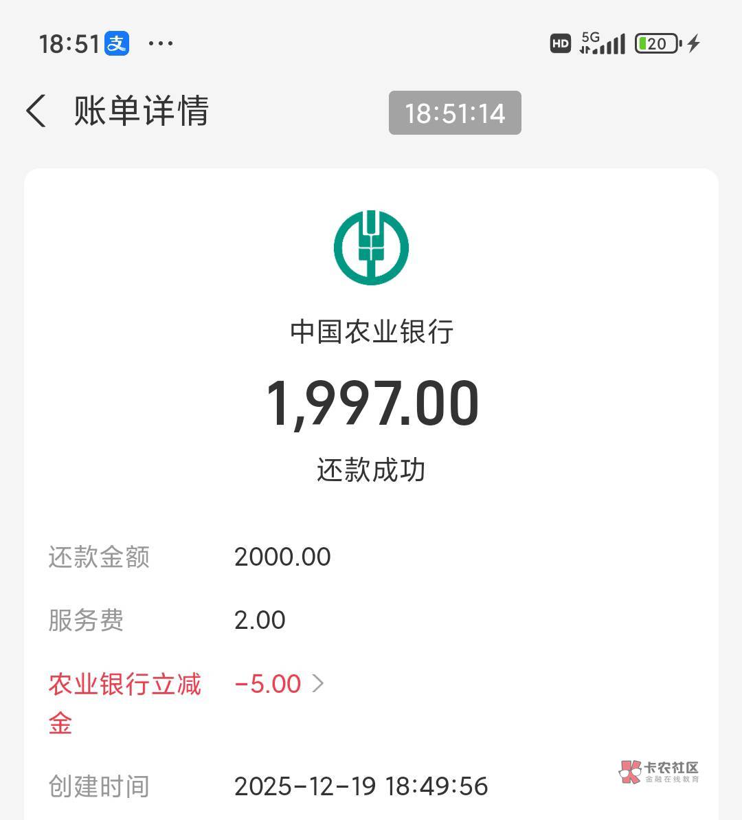 湖南农行电子二类支付宝还款2000-5去除手续费润3