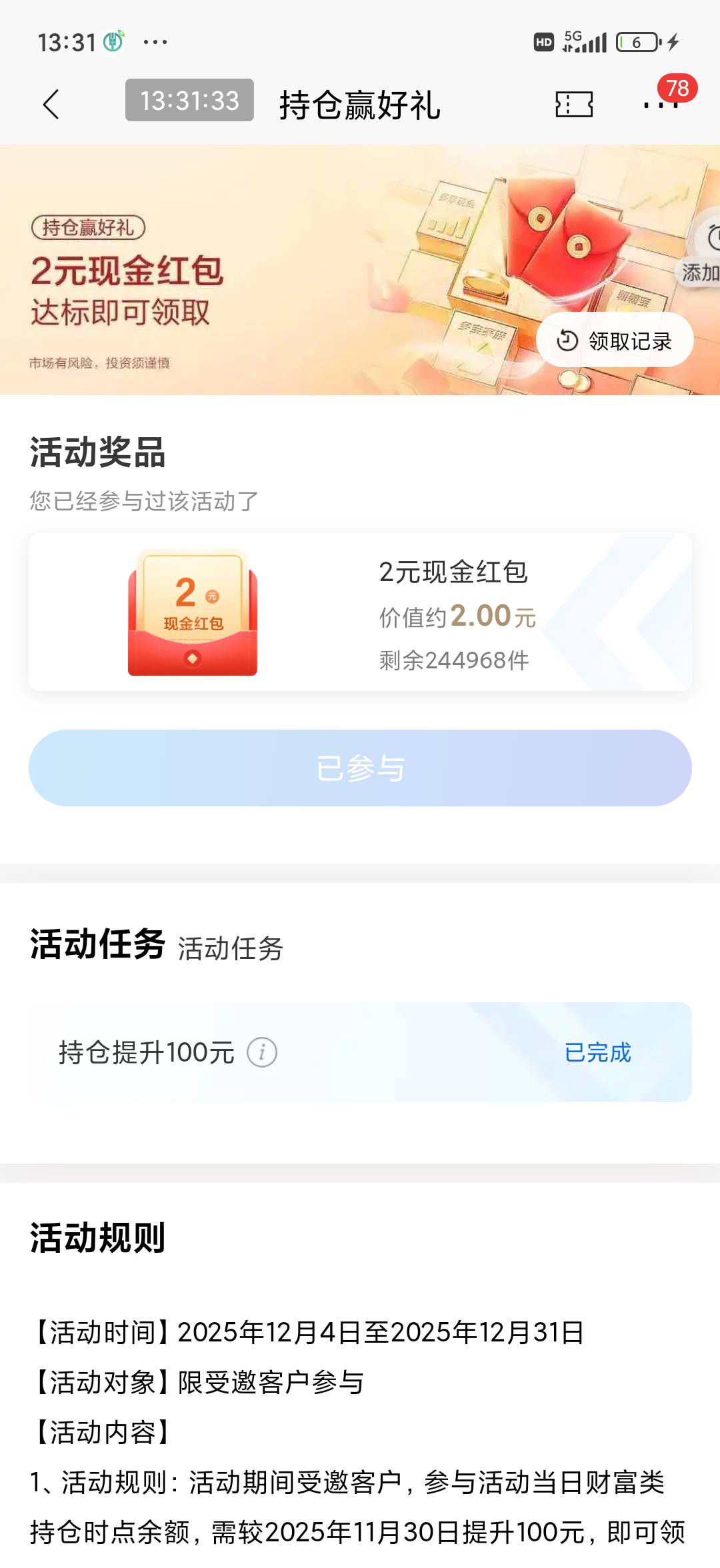 招行特邀,持仓好礼,复制不了链接,招招宝转入100以上即可领取2元