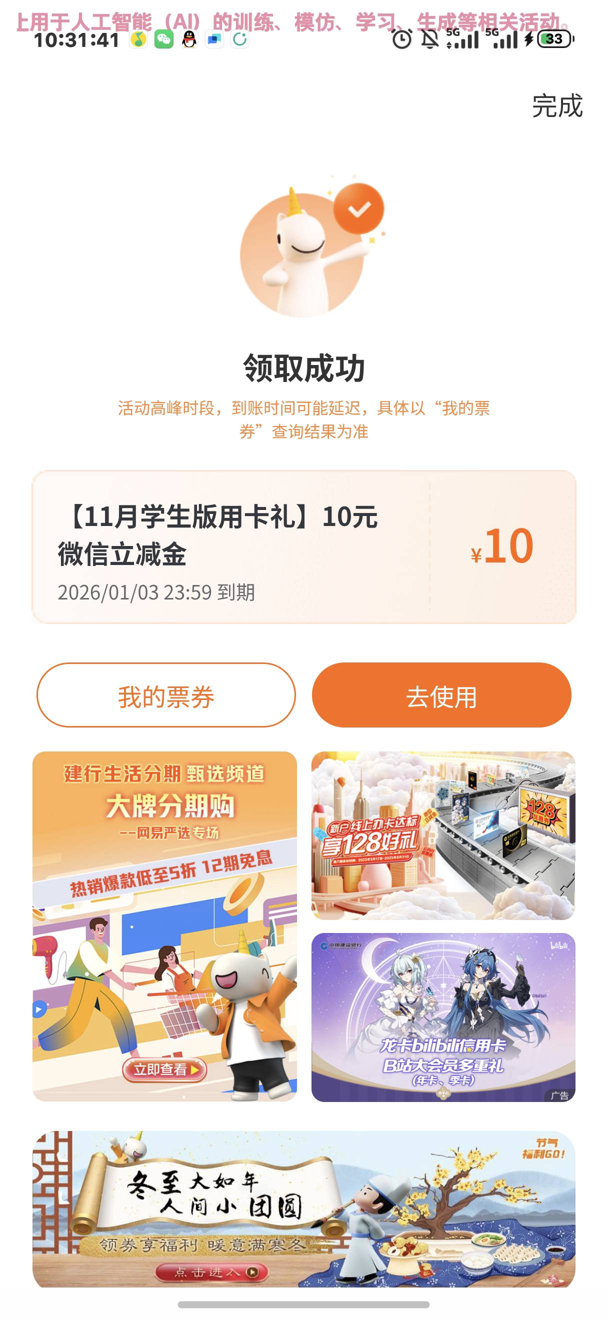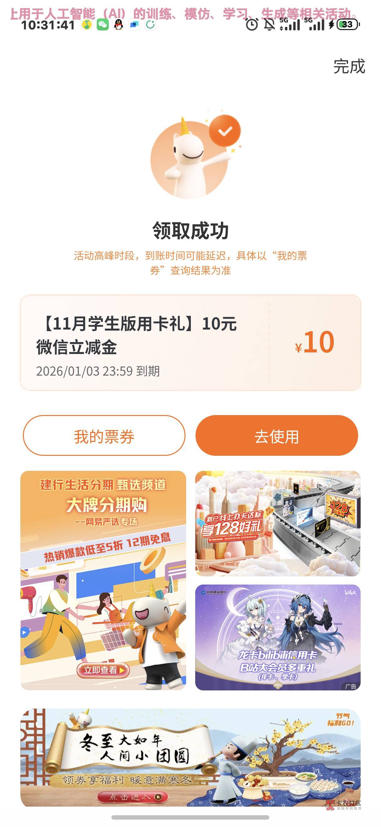 建行信用卡学生版微信立减金10