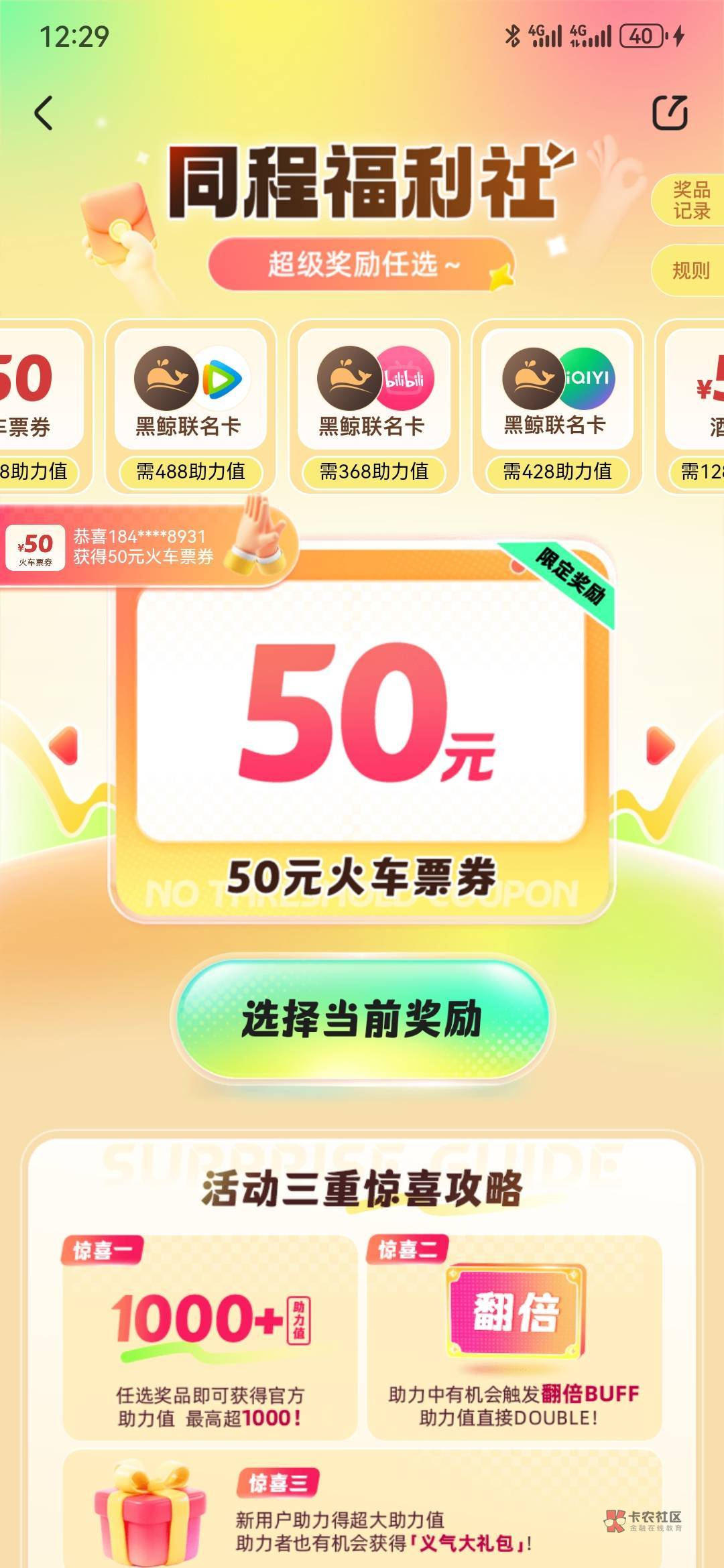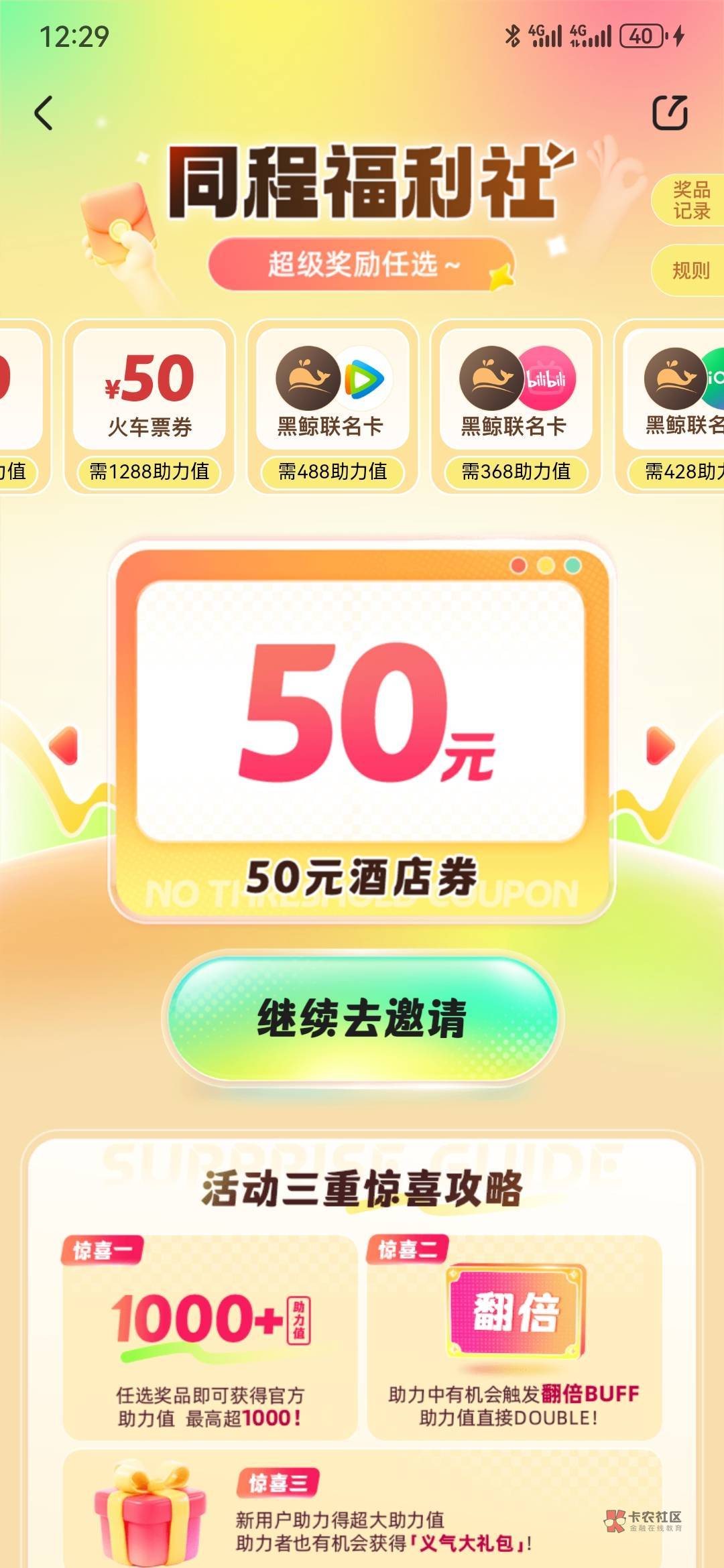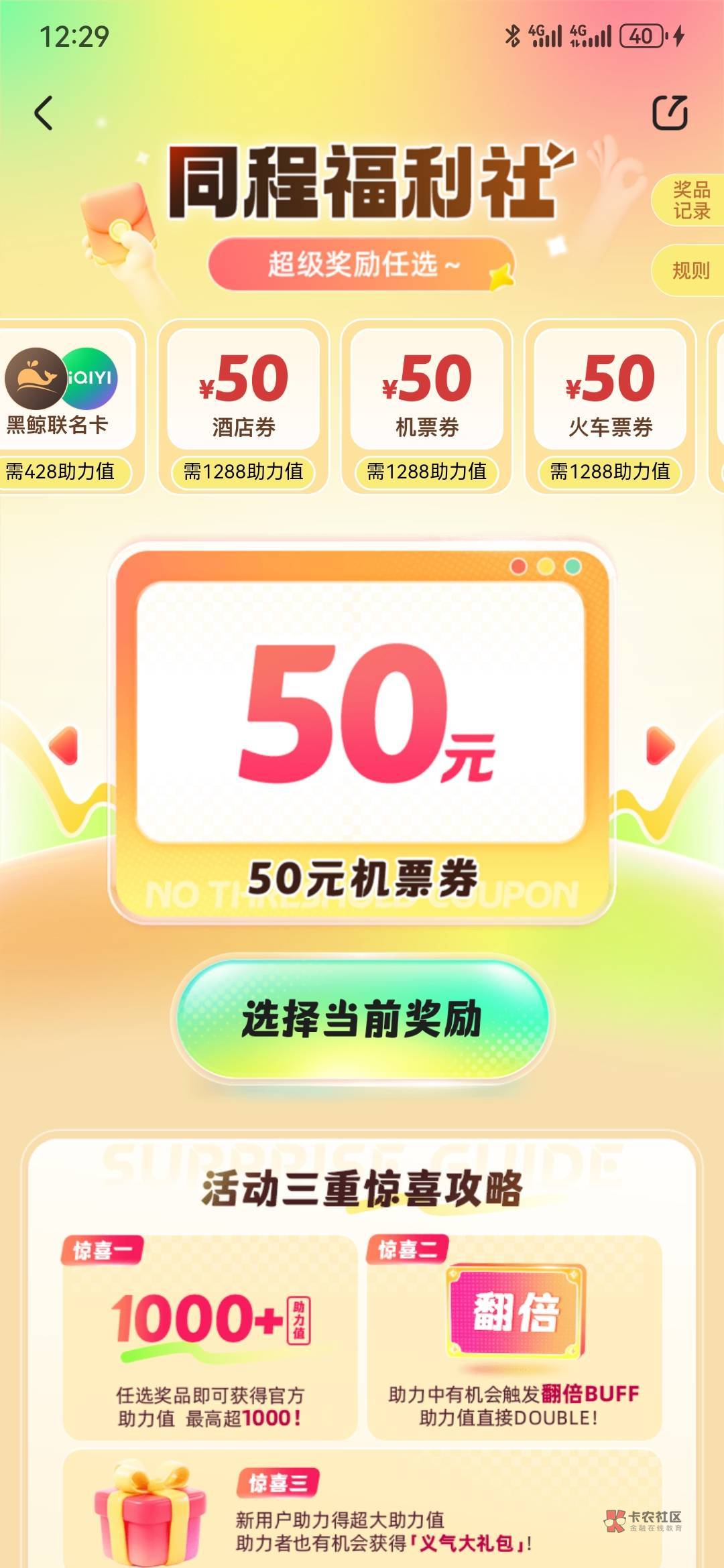 同程,搜同程福利社,50酒店+50火车+50飞机,任选三张,鱼上一堆代拉,自用不错