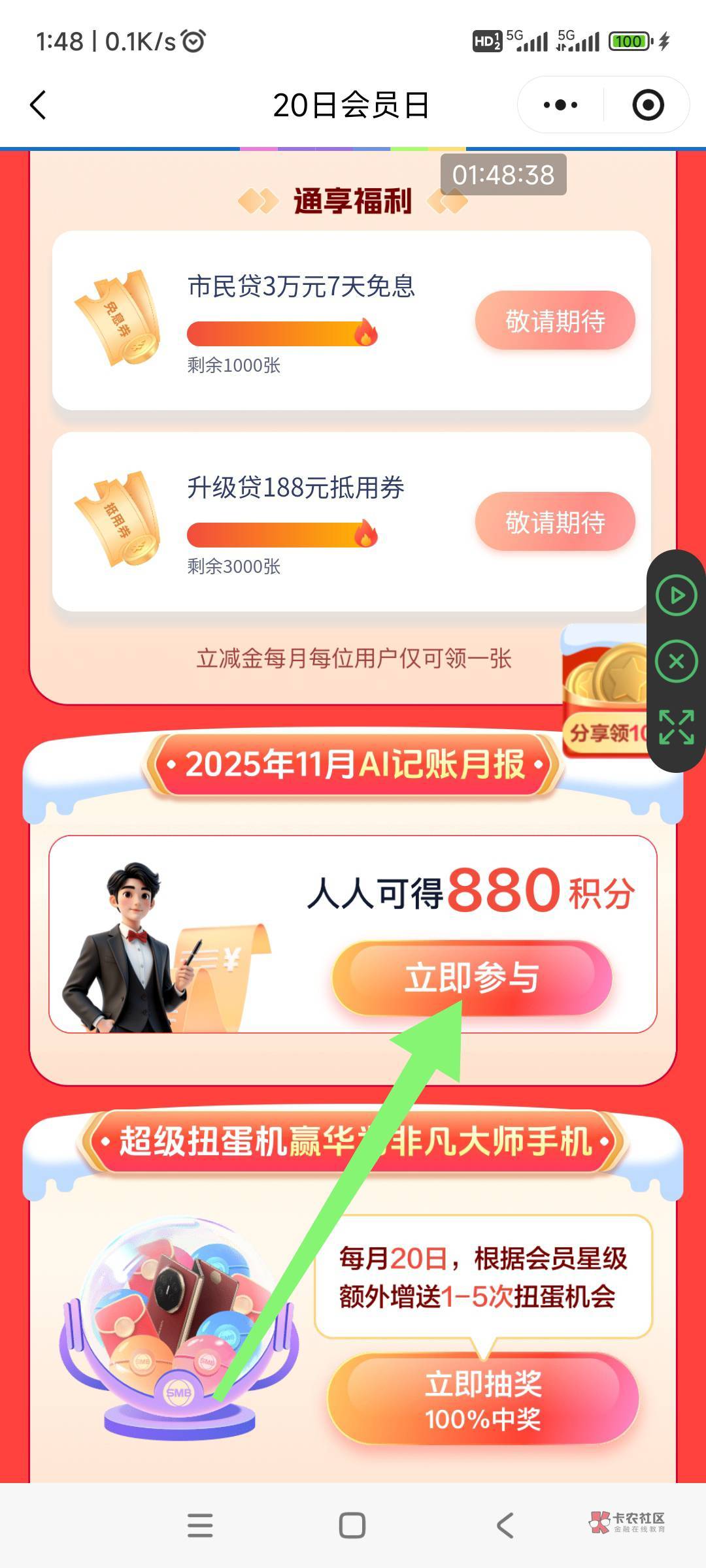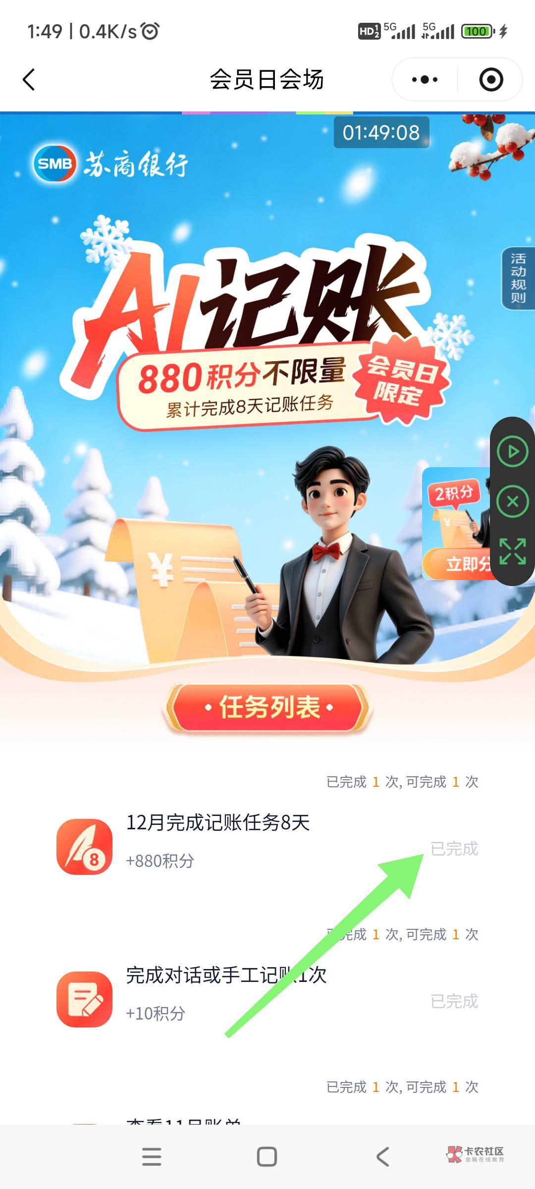 苏商银行,20日会员日进去,人人可得880积分,立即参与!12月完成记账8天(瞎记即可)8