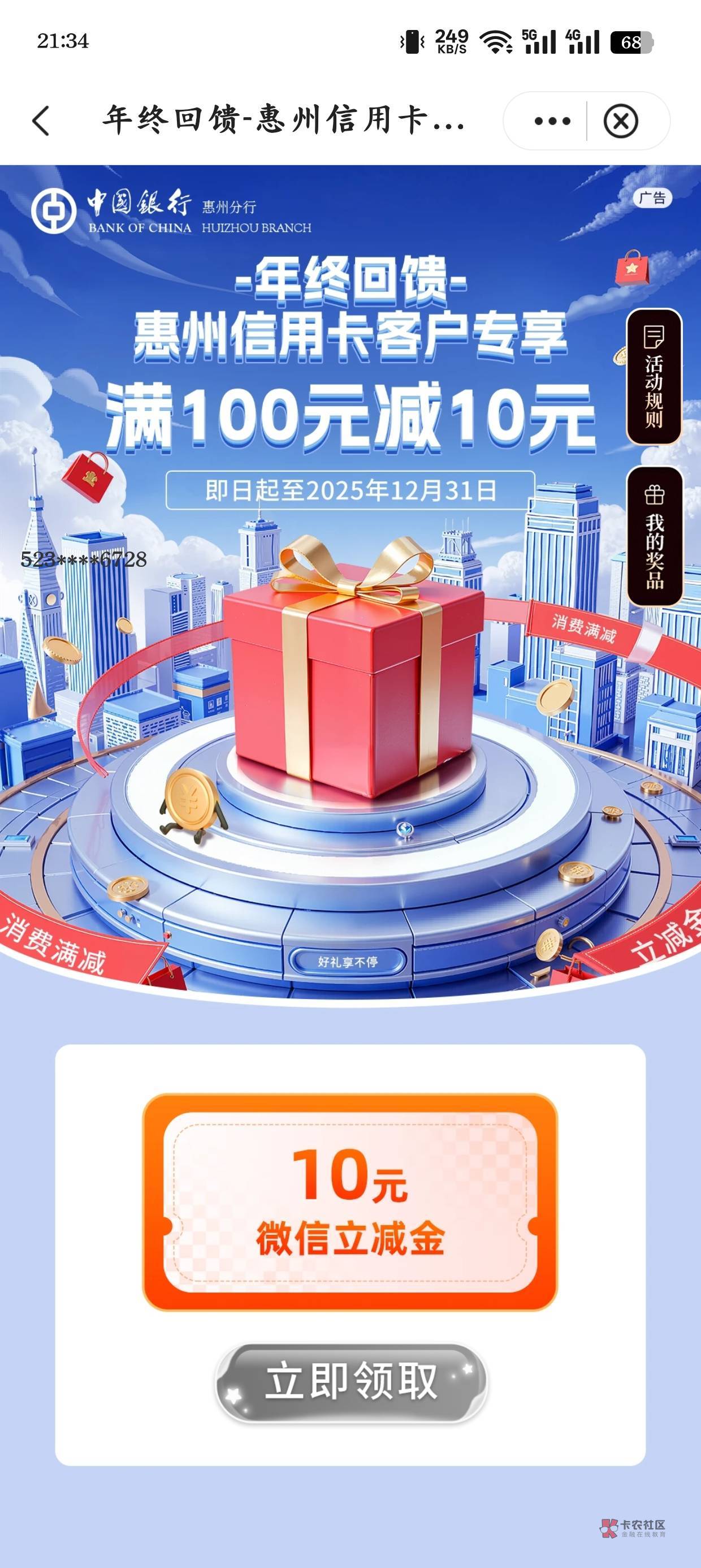 惠州中行信用卡年终回馈10元子