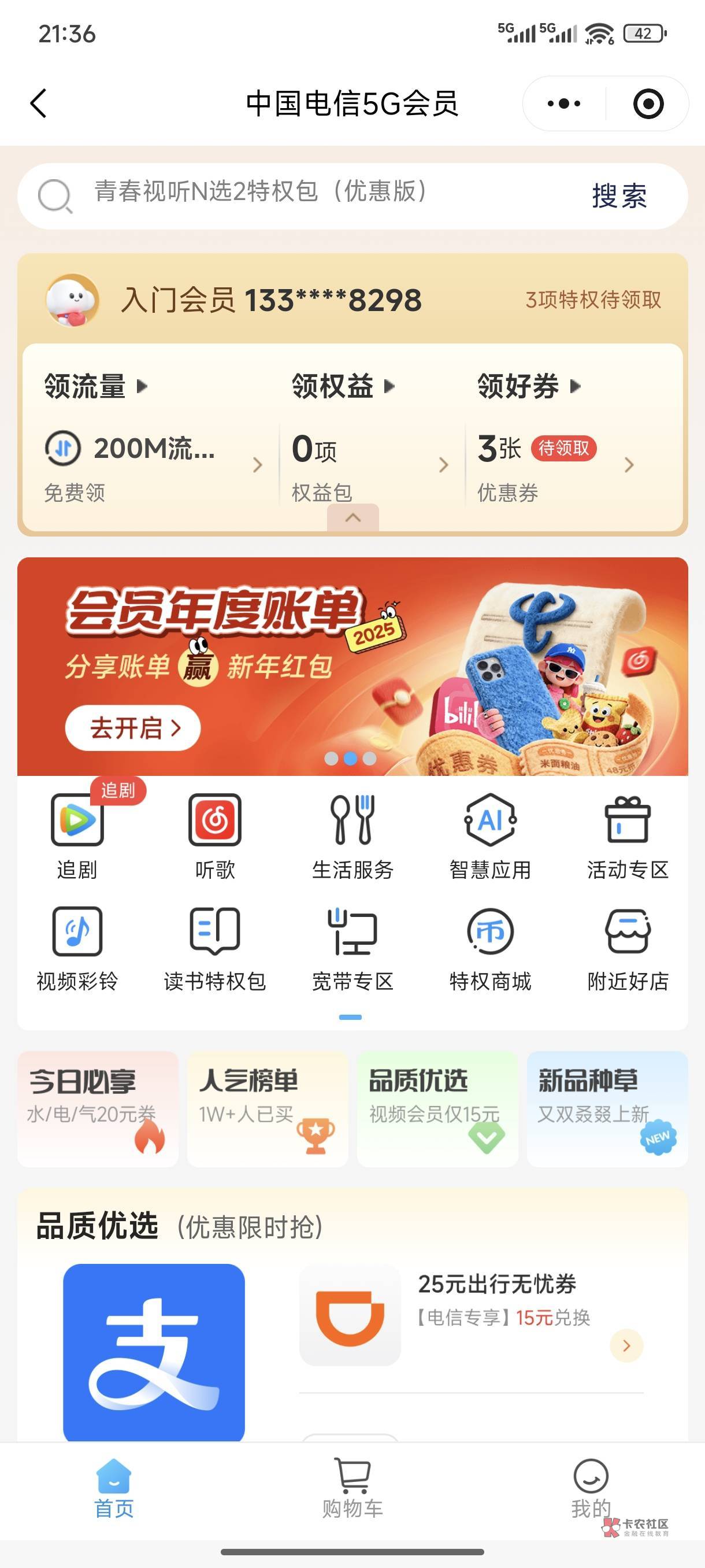 重庆电信,中国电信5g会员小程序,横幅年度账单抽奖,保底1.8。扫v码T