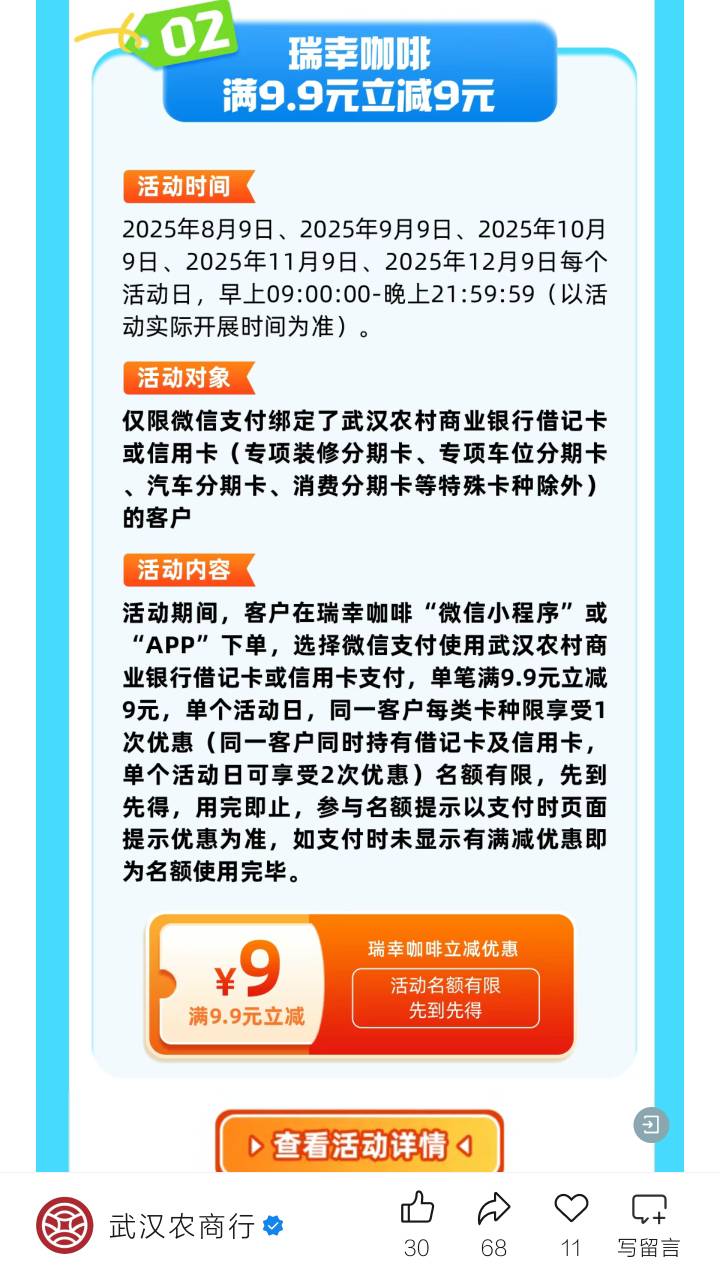 武汉农商今天0.9喝瑞幸