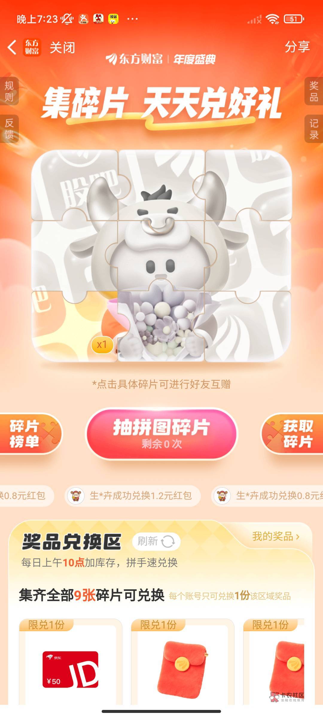1分钟人人3+ 东方财富app顶部搜索 集碎片 进活动… 任务全部做完去兑红包 只要不黑人