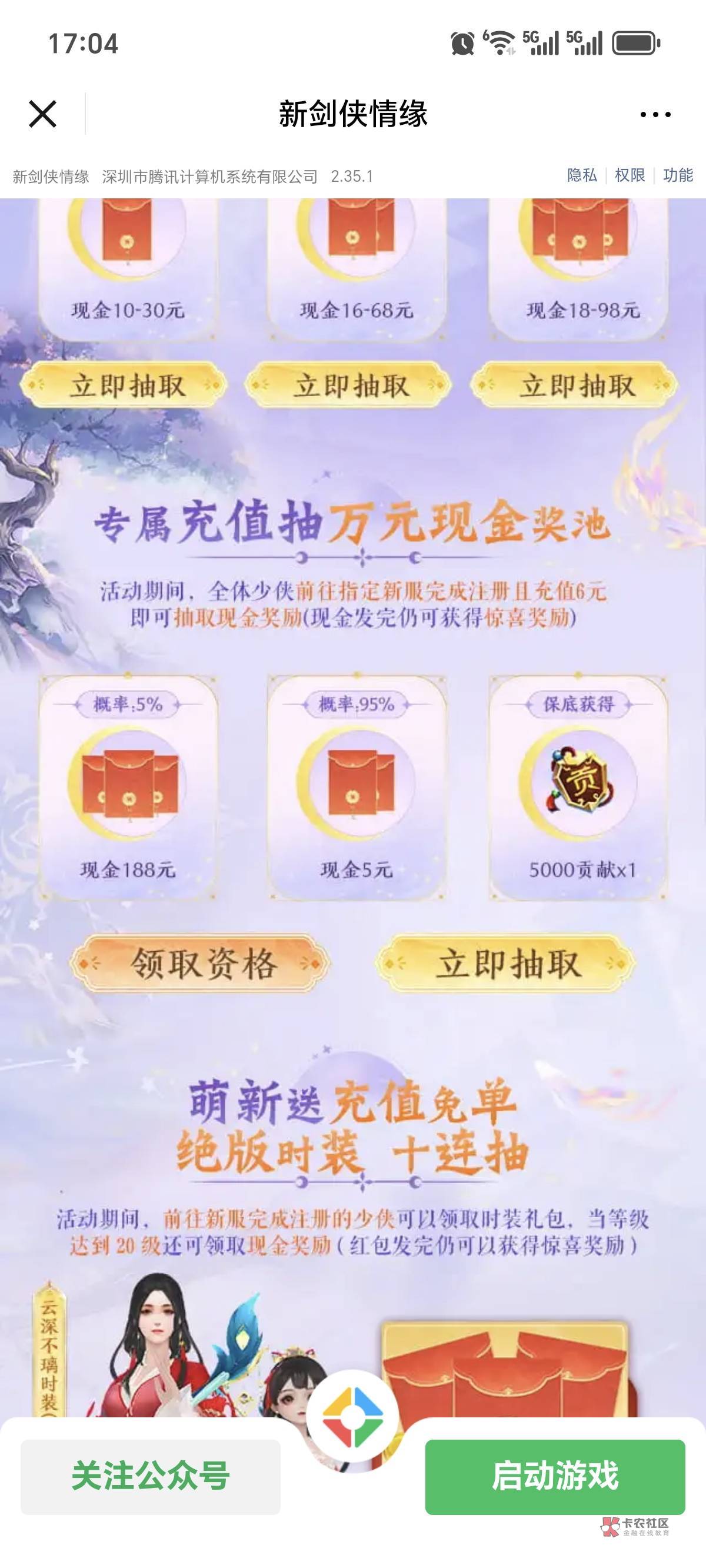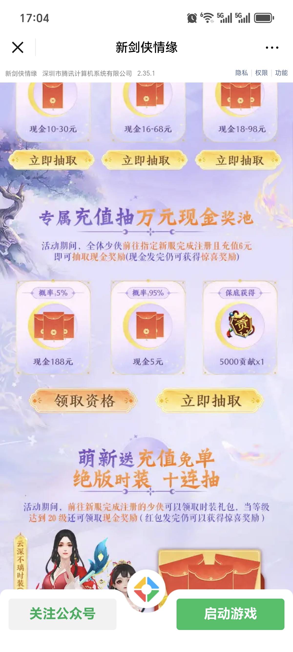 新剑侠新链接,之前11月256区充值过的可以继续玩这个链接,去微信速享2区建立新号,然后用新号验证资格,再抽5毛返利。不知道和上周257区的是否冲突,这个自己测试。https://game.weixin.qq.com/cgi-bin/actnew/newportalact/229305/Bg-eeJ1i1O2jYUJwr6vJklm7XXfk9NsSxb9bKitwW-U/main_page2?themecolor=31BC9D#wechat_redirect