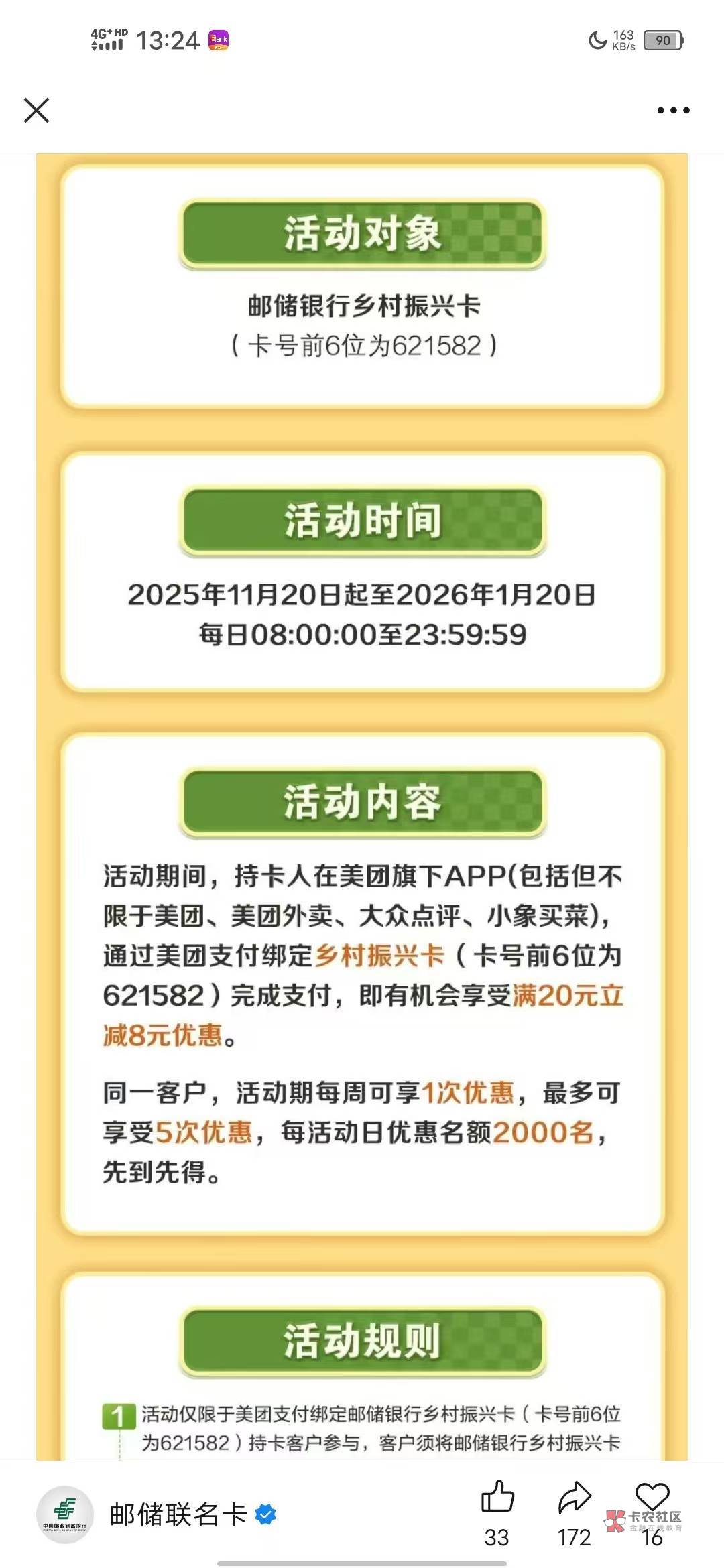 邮储乡村振兴卡美团支付满20-10每天8点开始一个星期一次一个月5次