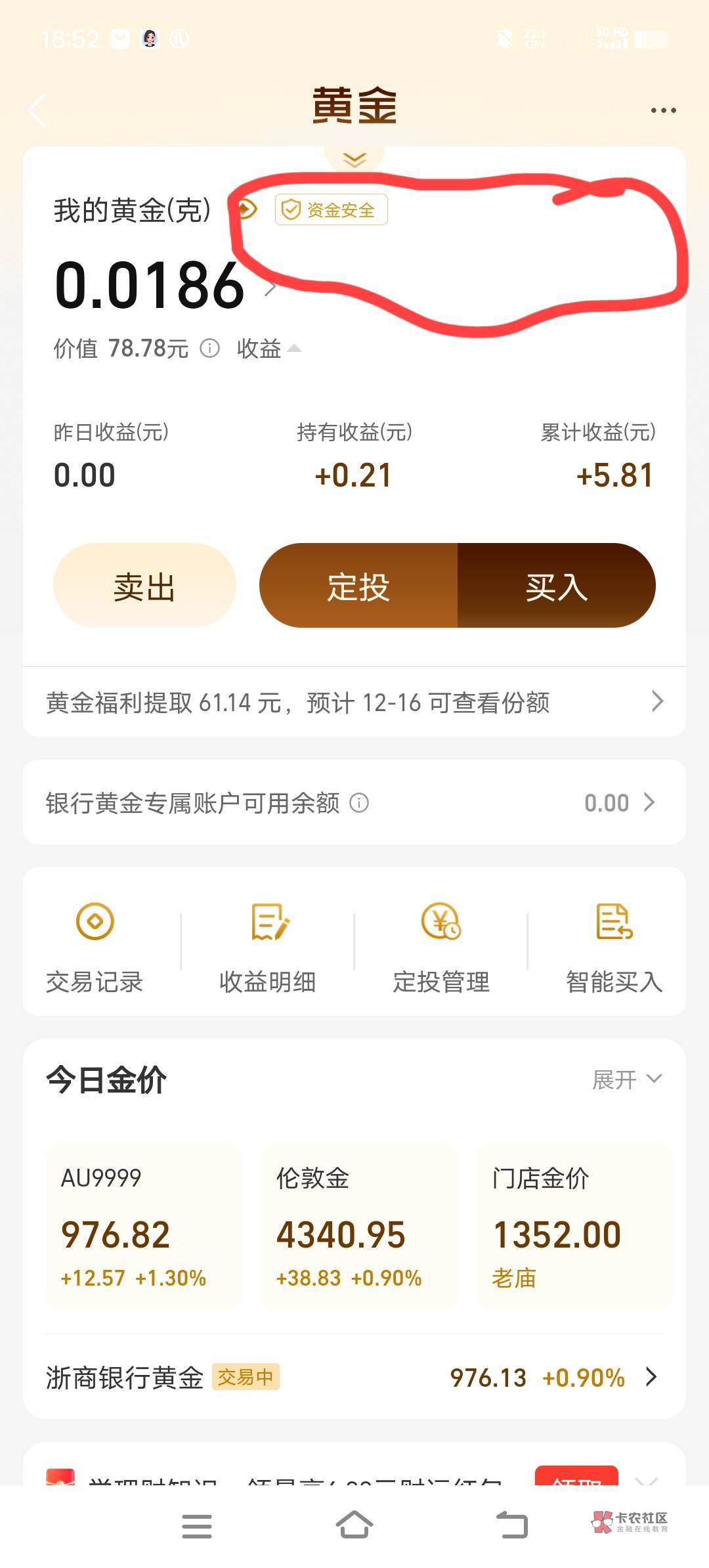 蚂蚁财富,黄金点进去,我画圈的位置,有一个浙商赠送8000微克黄金,需要开通积存金!有入口的可以去,签约一下就行了,8毛秒卖!管理加精