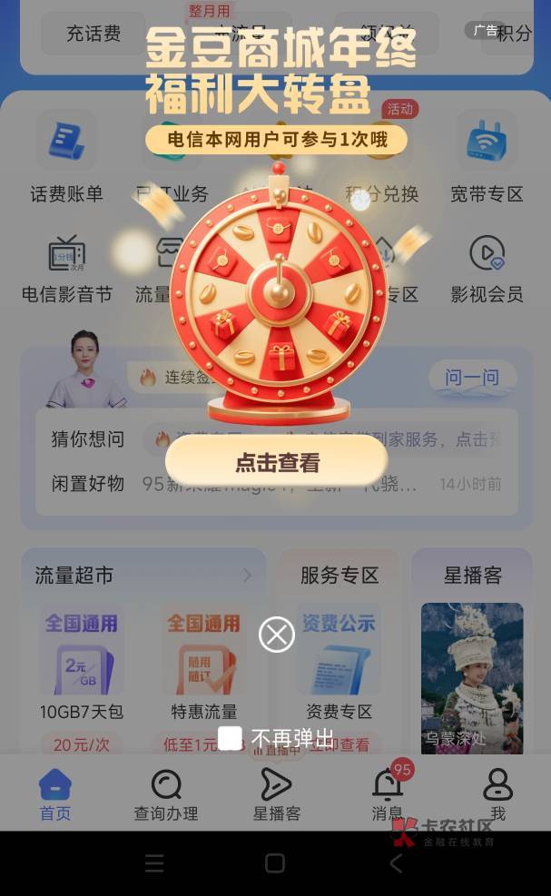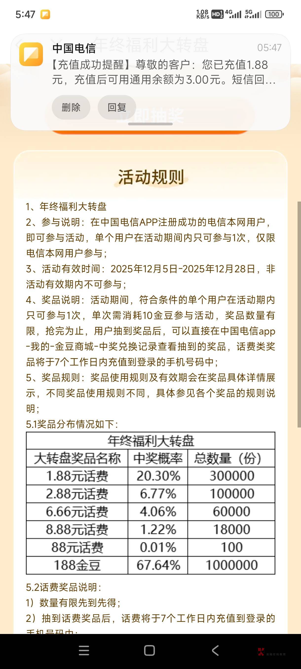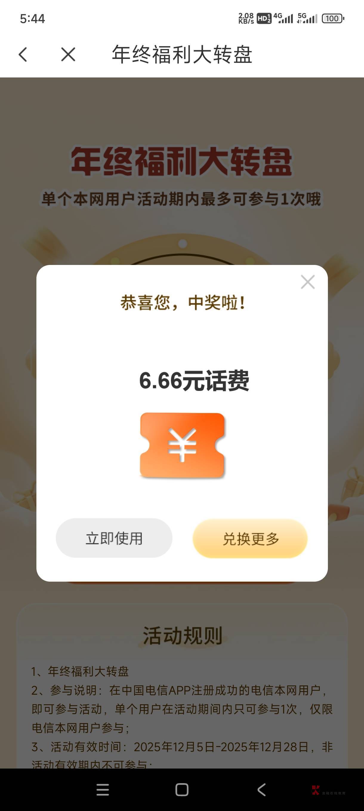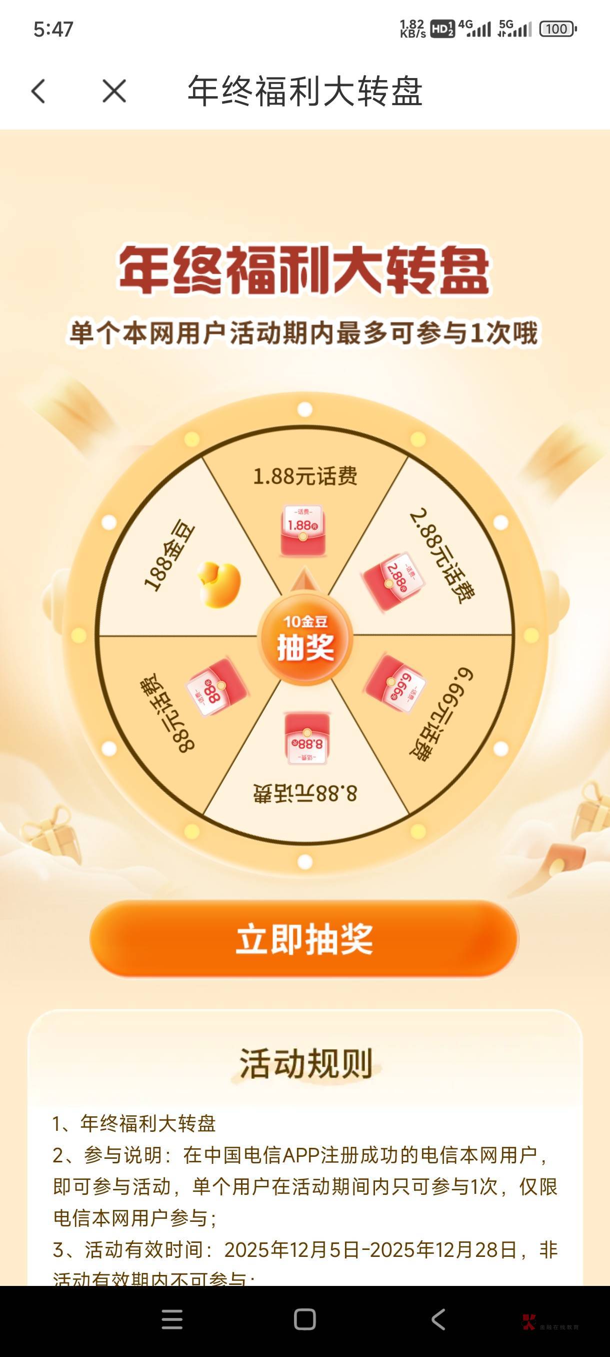 电信年终福利大转盘,抽话费了!两号,6.6+1.8